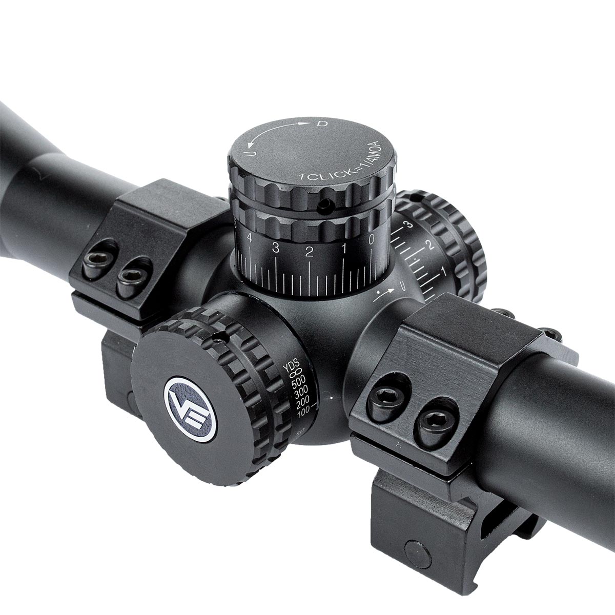 Possui ajuste vertical e horizontal sendo de 1 Click = 1/4MOA. Para a esquerda o ajuste sobe e para a direita o ajuste desce.