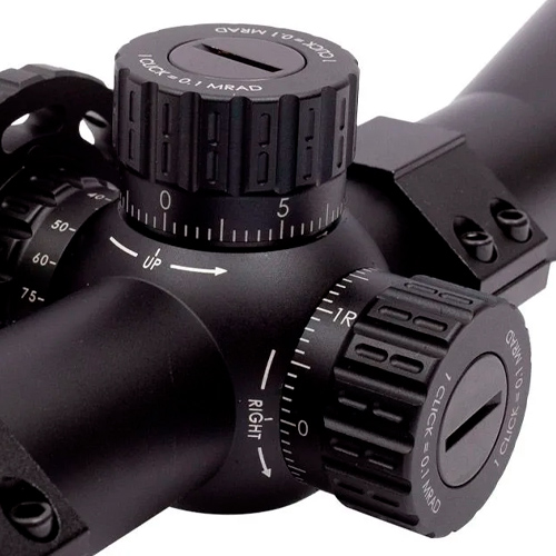 Torres com clique de 0.1 MRAD (80 MOA total) e sistema de bloqueio. Possui função Zero Reset para rápida redefinição de ajuste.