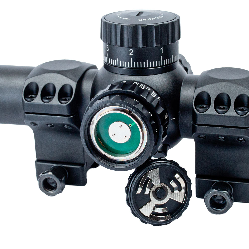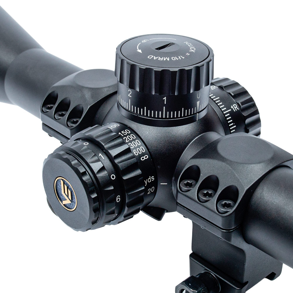 As torres de ajuste operam em um sistema MIL/MIL, cada clique corresponde a 1/10 de MIL (0.1 MRAD), perfeitamente sincronizado com o retículo. As torres táticas, além de possuírem um sistema de trava que previne movimentos acidentais, são equipadas com a função Zero Stop. Este mecanismo permite que o atirador, após zerar o rifle, possa fazer múltiplos ajustes de elevação para diferentes distâncias e, ao final, retornar de forma rápida e tátil ao seu zero original, sem a necessidade de olhar para a torre, uma função indispensável em situações de baixa luminosidade.