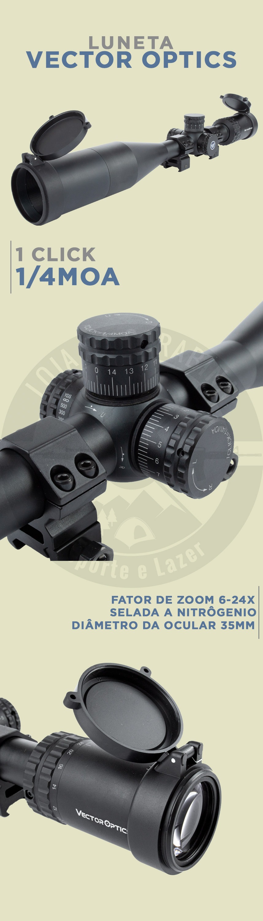 Esta é uma Luneta 6-24x50 construída em alumínio resistente a corrosão e oxidação, utilizado até mesmo no setor aero espacial. Seu tubo tem diâmetro de 1 polegada, proporcionando uma ótima entrada de luz em situações de baixa luz. Alinhando isso ao fato de sua objetiva ter 50mm, obtém-se uma visão mais clara do alvo em zoom 24x.