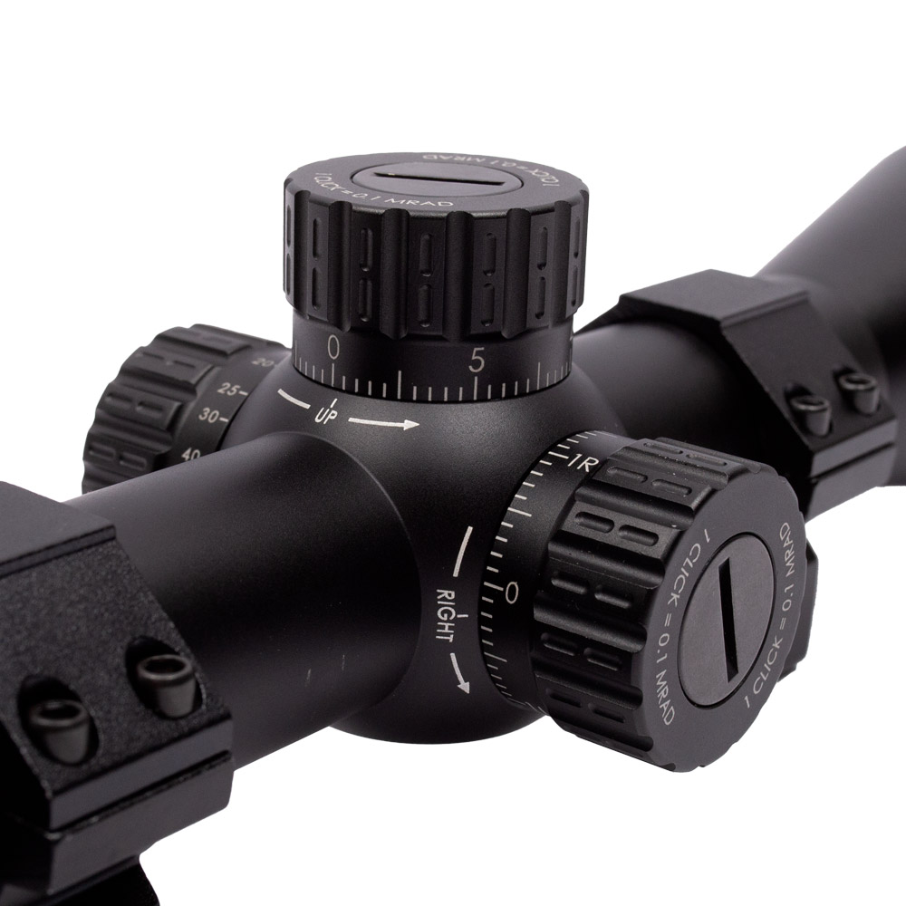 Possui faixa de ajuste de 60 MOA feito por torres de ajuste vertical e horizontal. Cada click equivale a 0.1 MRAD. As torres possuem função zero reset.