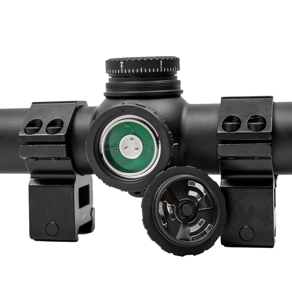 Ponto central iluminado em vermelho com seis níveis de brilho ajustável, ajudando a manter o retículo visível em diferentes condições de luz.