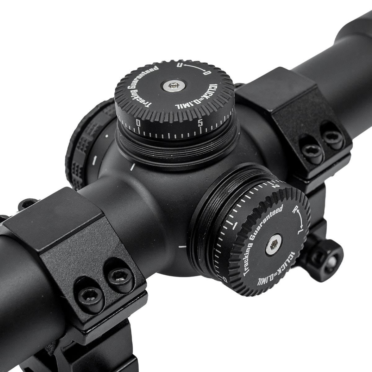 Torres de ajuste com cliques de 0,1 MRAD permitem regulagens finas de elevação e lateralidade, com cada clique movimentando cerca de 1 cm a 100 m — ideal para precisão tática.