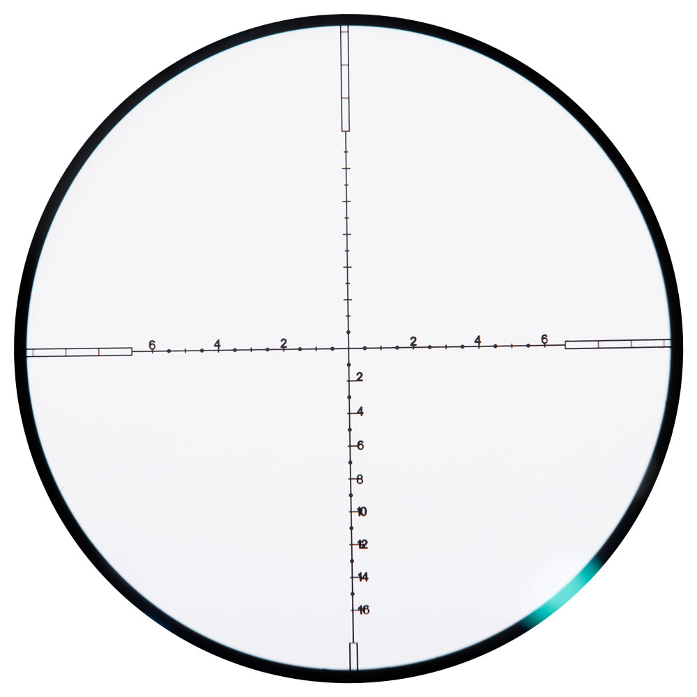 Possui retículo mil dot iluminado (IR) nas cores verde e vermelho. Possui 05 níveis de ajuste do brilho que pode ser alterado facilmente pela torre de ajuste na lateral.