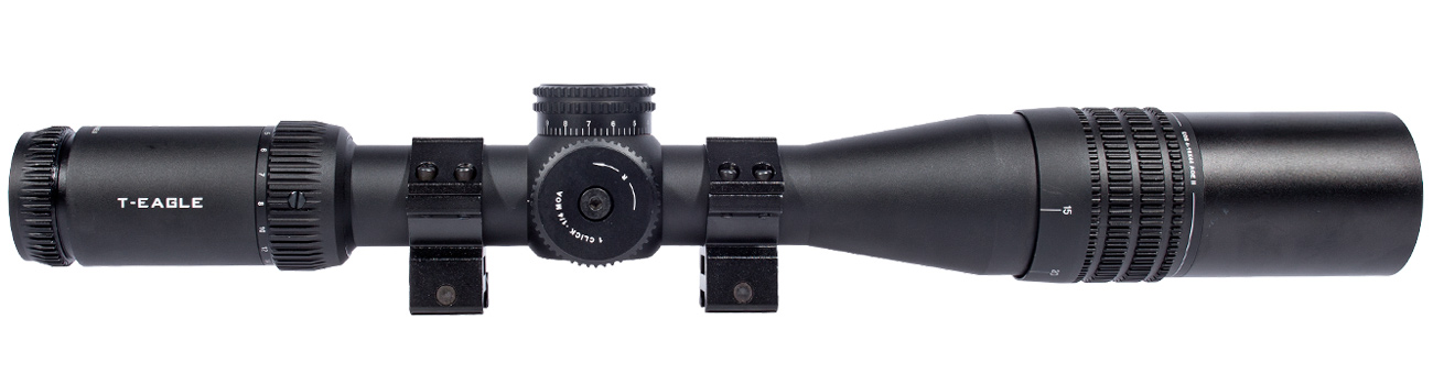 Luneta T-Eagle EOS (Enhanced Optical System) com zoom ajustável de 4x a 6x e objetiva de 44 mm com ocular de 35 mm.
