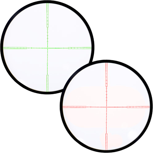 Conta com retículo HK iluminado (IR) nas cores verde e vermelho. Possui 05 níveis de ajuste do brilho que pode ser ajustado pela torre lateral. Retículo alimentado por uma bateria CR2032.