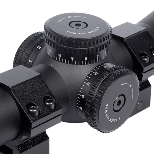 Possui torres de ajuste vertical e horizontal com cliques de 1/4 MOA. Cada clique ajusta o ponto de impacto em 0,7 cm a 100 metros. Esses ajustes permitem regulagens extremamente finas e maior precisão nos disparos.