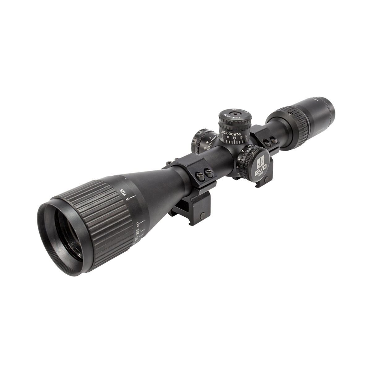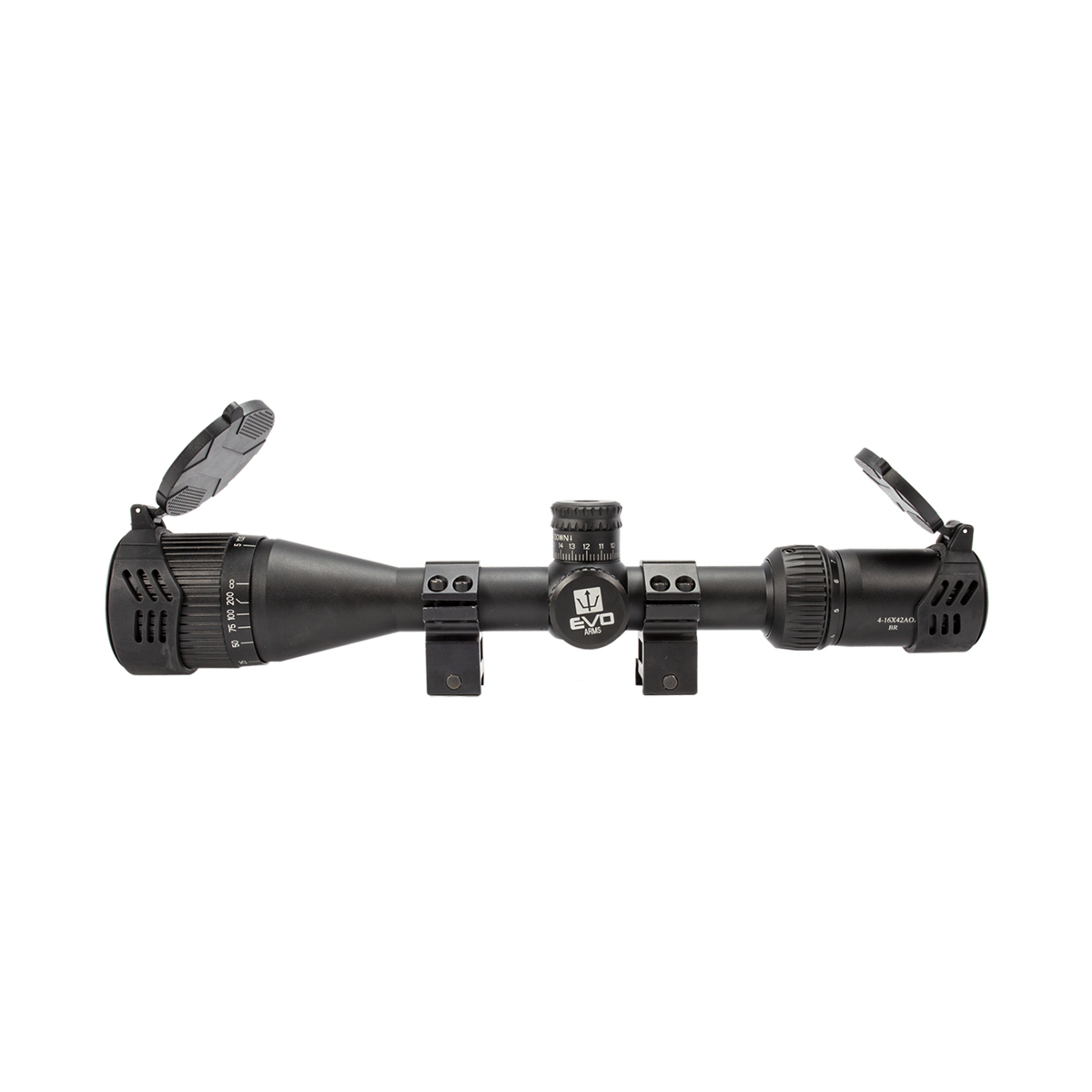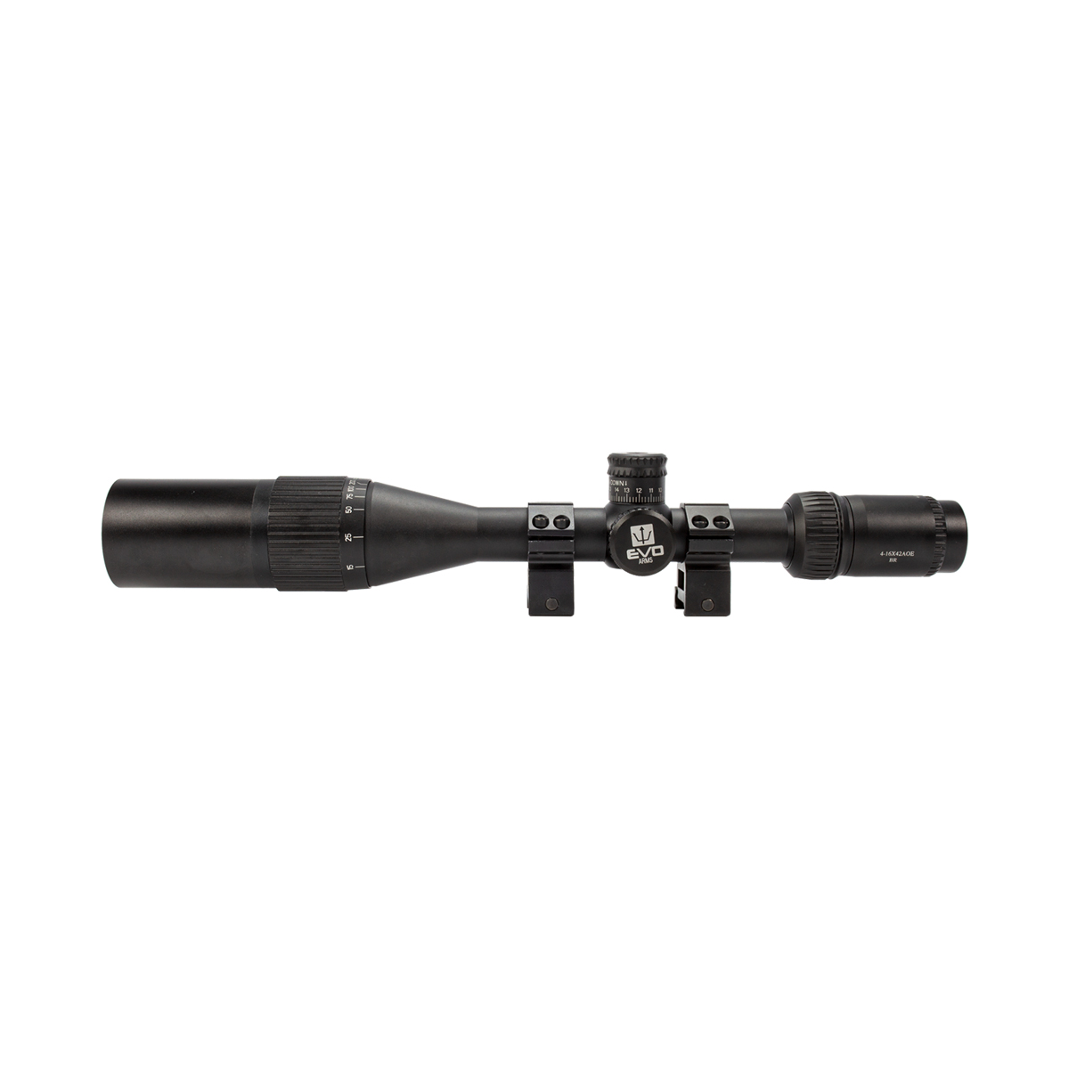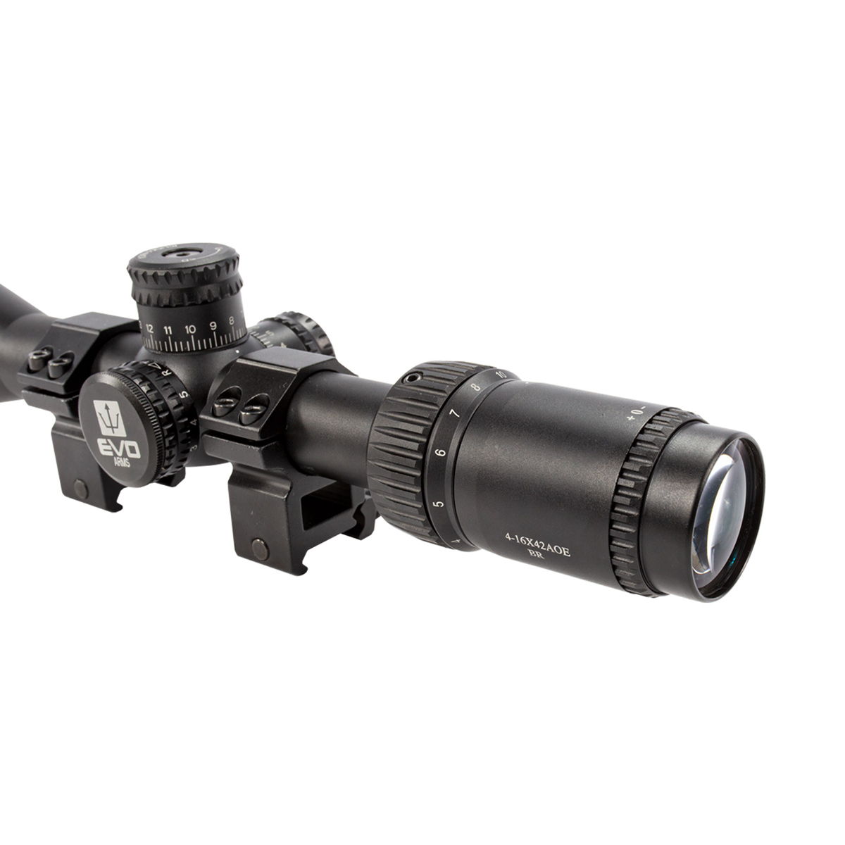 Luneta Evo com zoom de 4x até 16x e com objetiva de 42mm, fabricada em alumínio com altíssima qualidade.