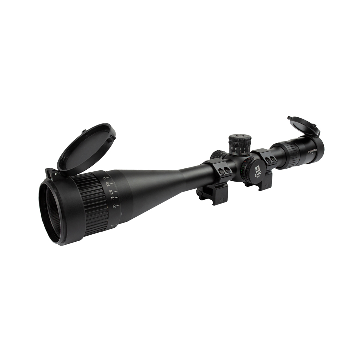 Luneta Evo 6-24x44mm fabricada em alumínio pela Evo com retículo Mil Dot iluminado indicada para uso em Armas de fogo, Rifle Airsoft e Carabinas PCP.