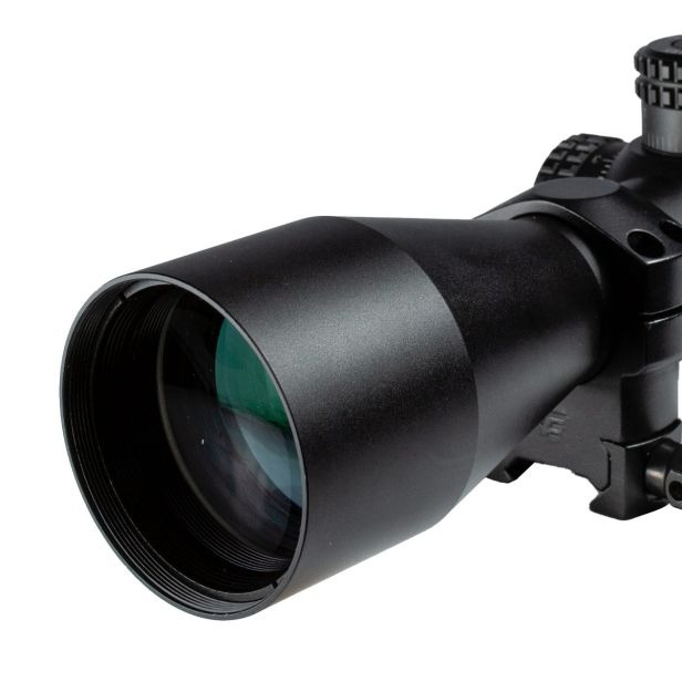 Seu retículo é muito fino, do tipo MPR-4 ideal para deixar o alvo bem à vista, sem cobri-lo. É gravado diretamente no vidro garantindo muito mais resistência. Lembrando que por se tratar de uma luneta FFP (first focal plane) o retículo vai aumentar junto quando der zoom. Essa é uma função que facilita o disparo visto que não há necessidade em fazer compensação conforme o zoom.