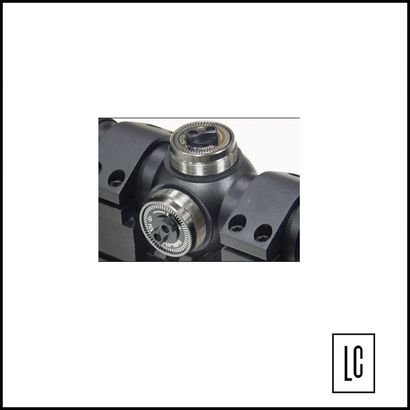 Possui ajuste através das torres de ajuste, sendo cada click equivalente a 1/4 MOA. O ajuste é por click, ou seja, não necessita de chave para regular a mira.