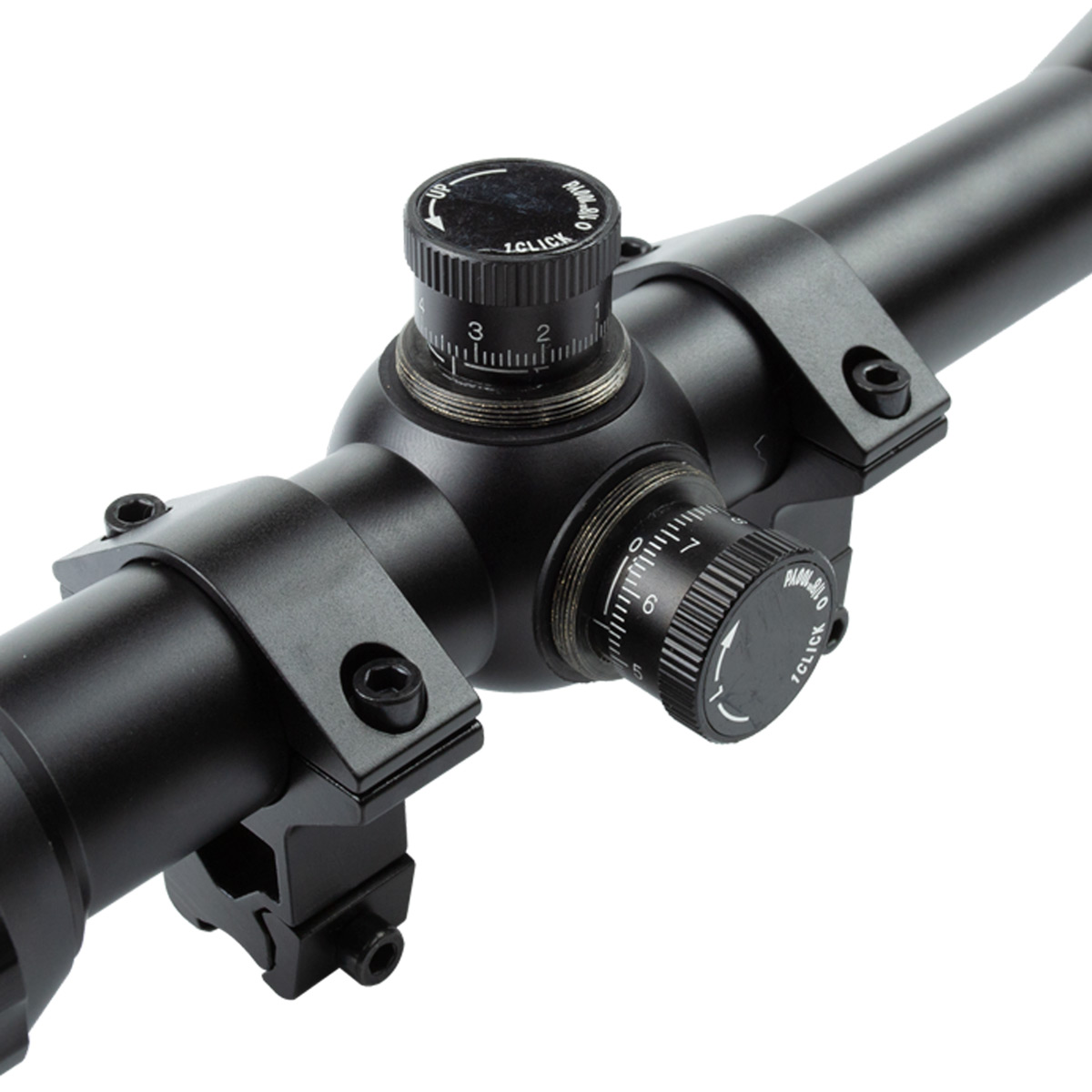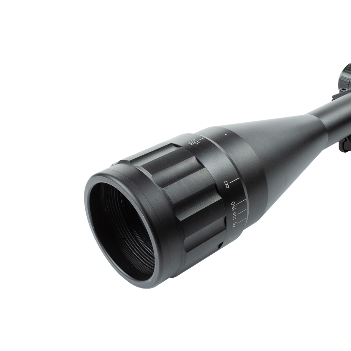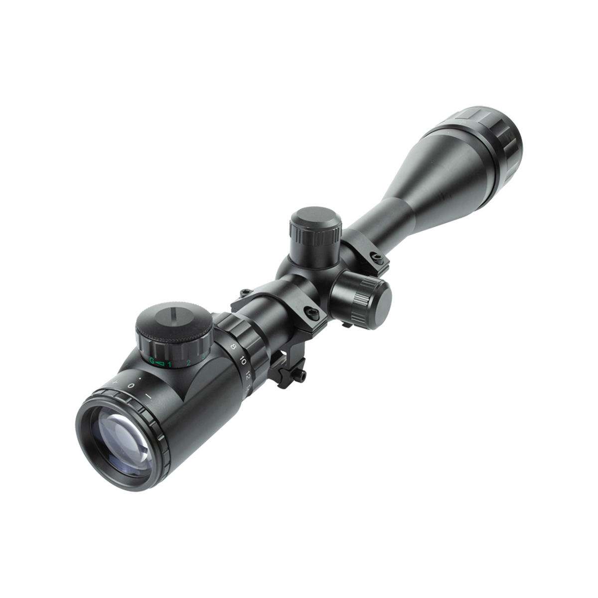 Luneta em metal com retículo mil dot iluminado com torre de ajuste para nível de intensidade do brilho.