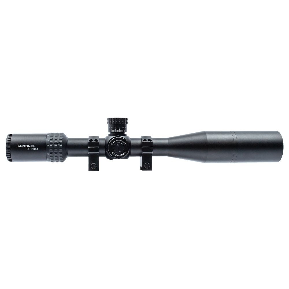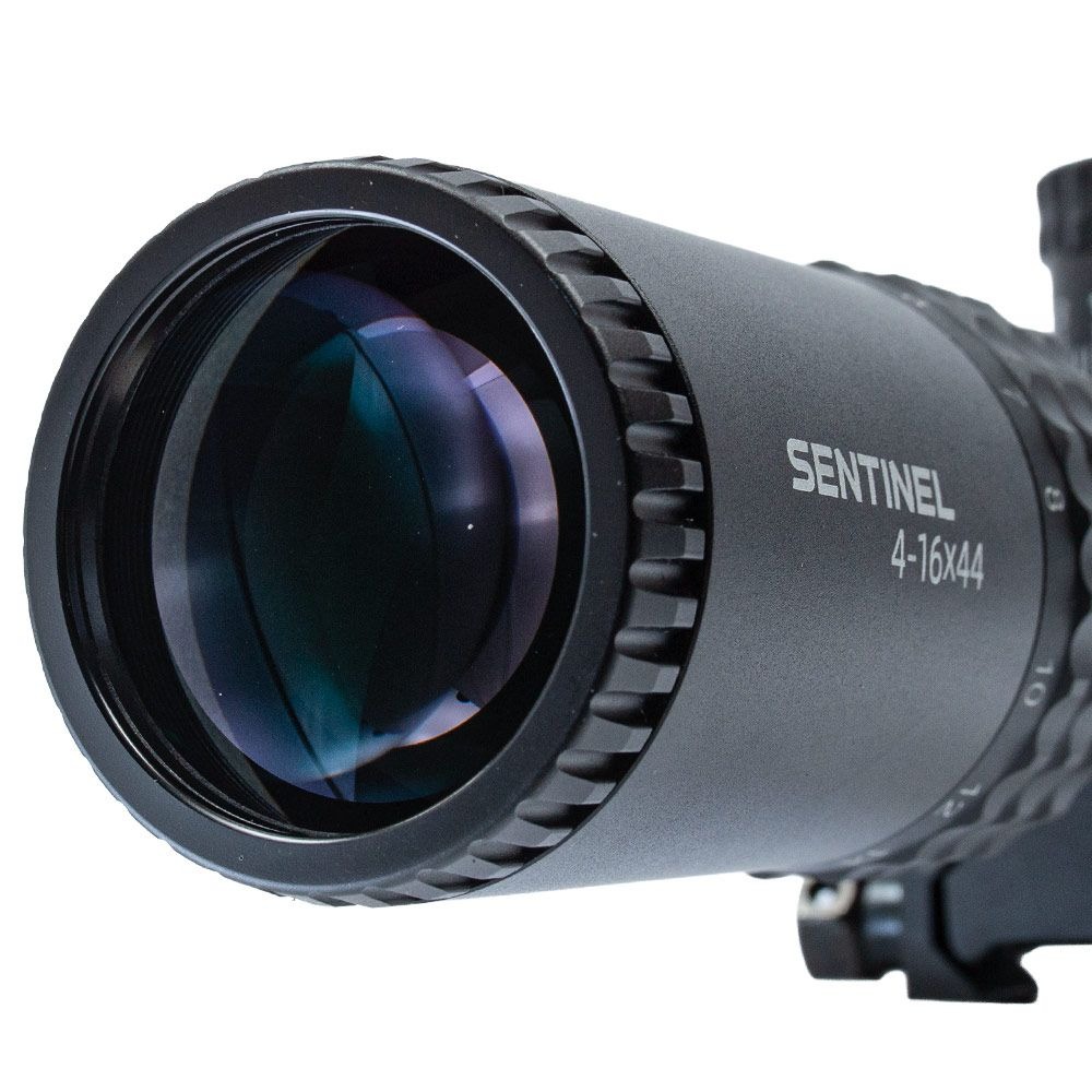 A Sentinel 4-16x44 FFP também acompanha mount duplo em metal para trilho de 20 mm, garantindo uma fixação robusta e segura à arma; parasol (sunshade) para proteção contra reflexos laterais e chuva leve, melhorando a visibilidade em condições de luz intensa; tampas flip up emborrachadas para proteger as lentes contra poeira e arranhões.