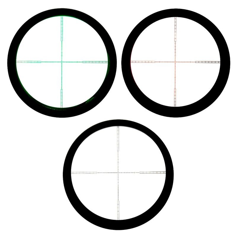 O retículo é iluminado nas cores verde e vermelho com 5 níveis de ajuste na intensidade do brilho. A alimentação do retículo é por uma pilha CR2032 (não inclusa).