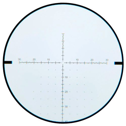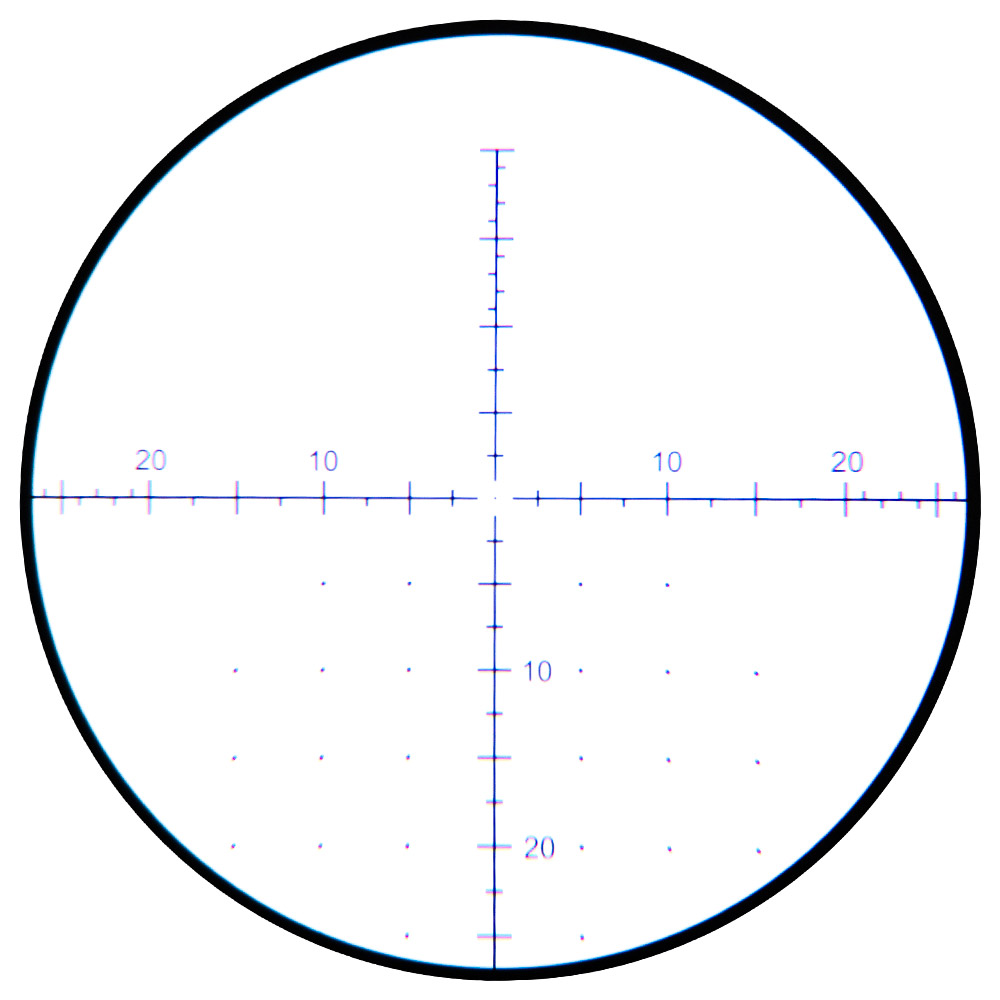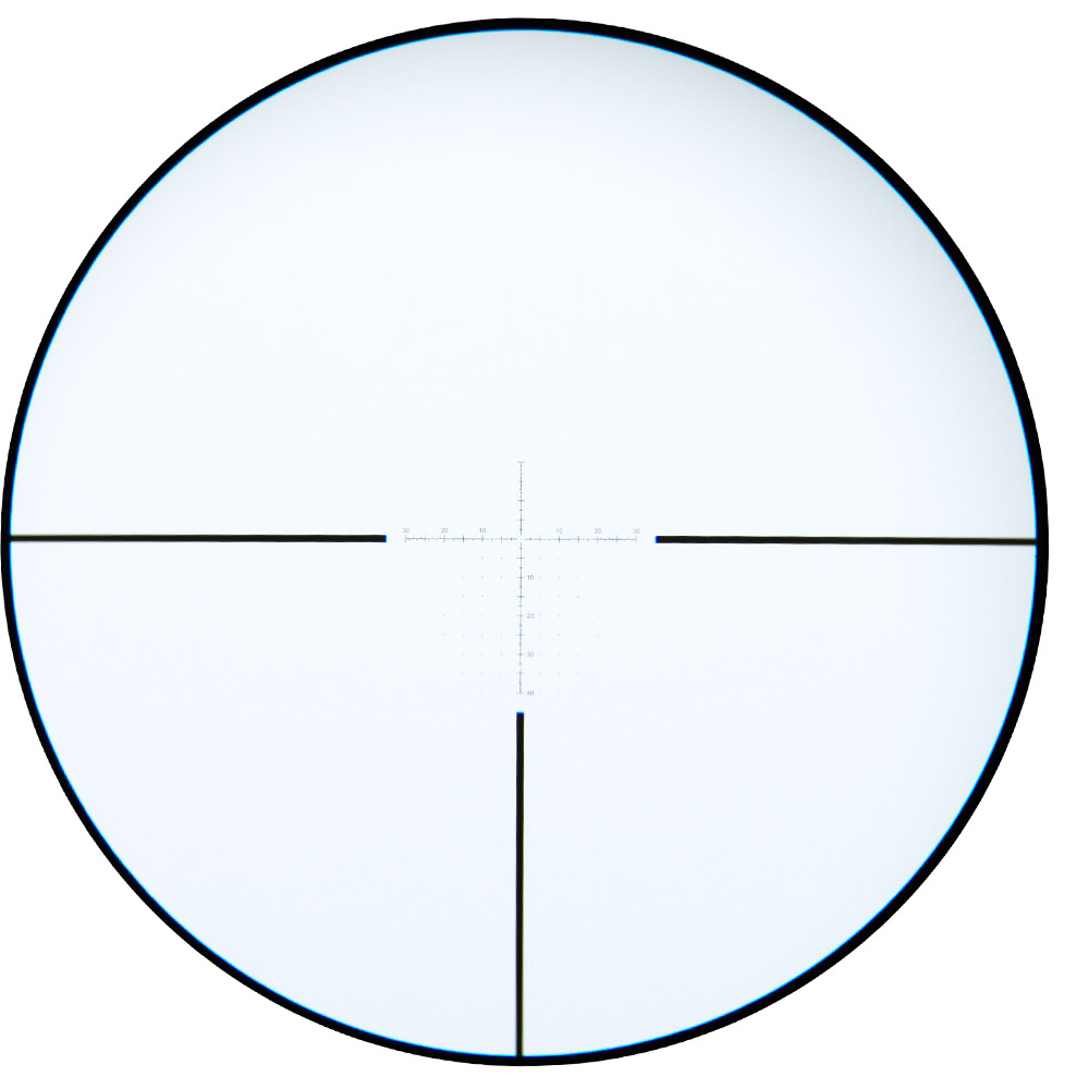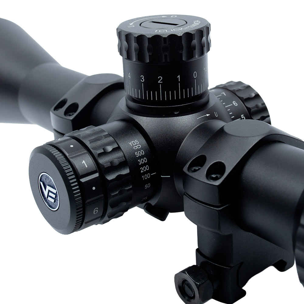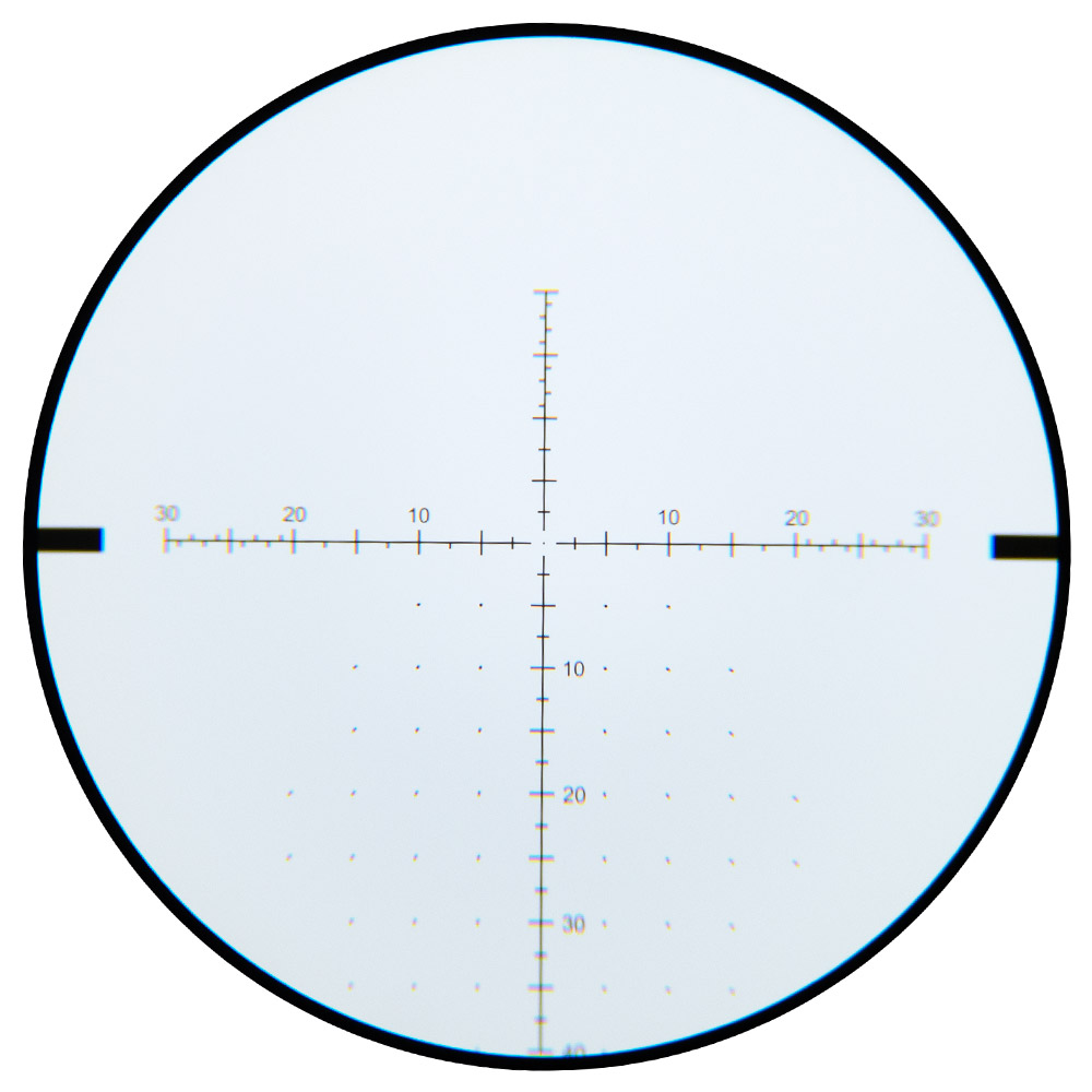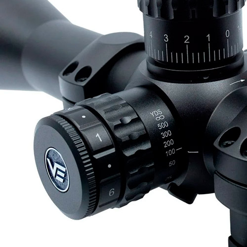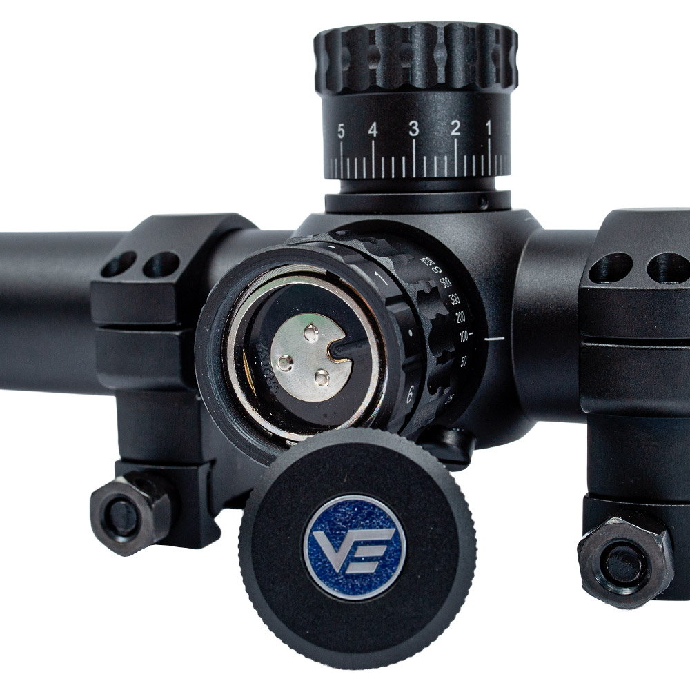 Possui retículo VSE-5 MOA, posicionado no primeiro plano focal (FFP - First Focal Plane). Ideal para quem alterna entre diferentes distâncias de disparo ou para atiradores que precisam de ajustes rápidos em campo.