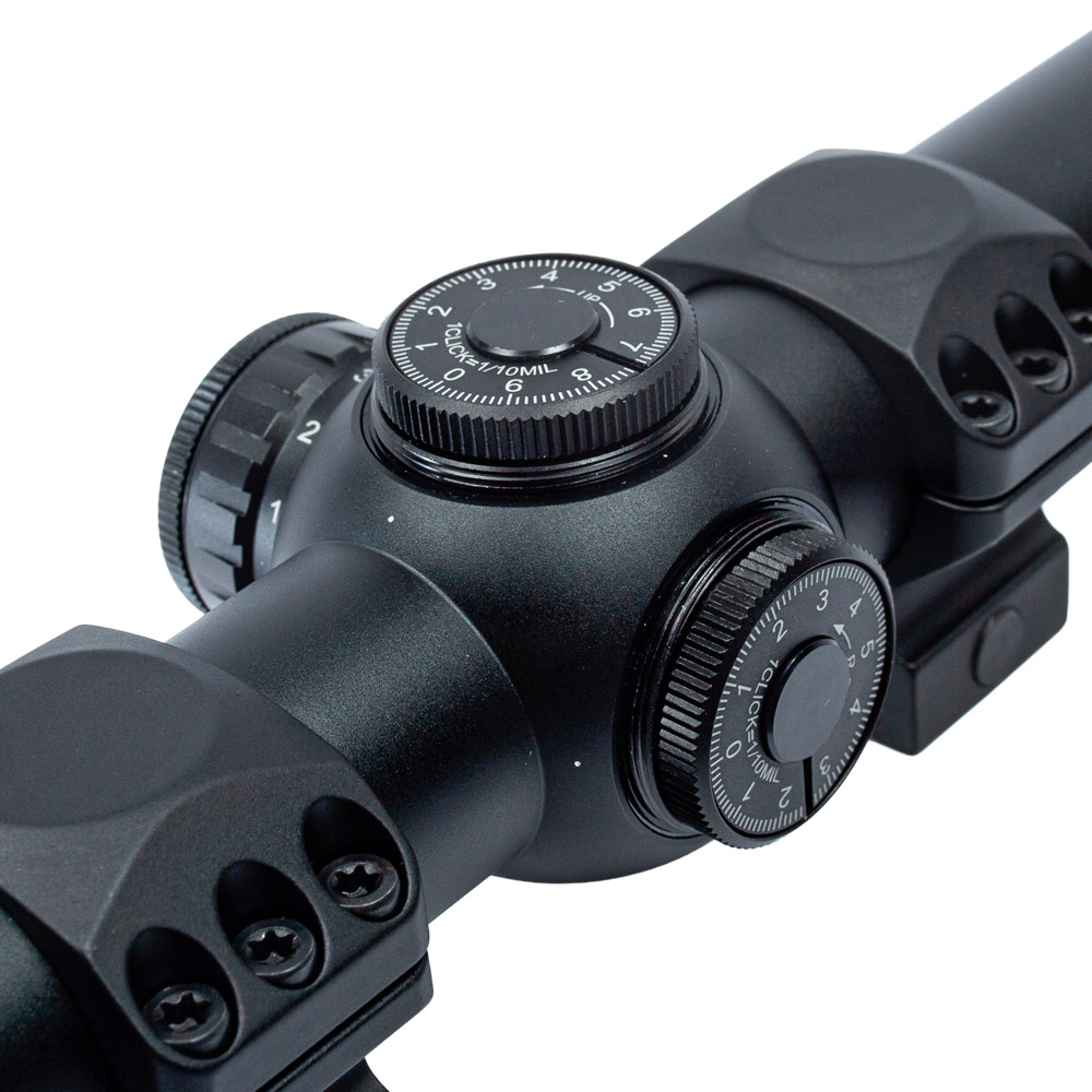 Cada clique das torres move o ponto de impacto em 0,1 MIL, oferecendo regulagem fina e precisa para vento e elevação.