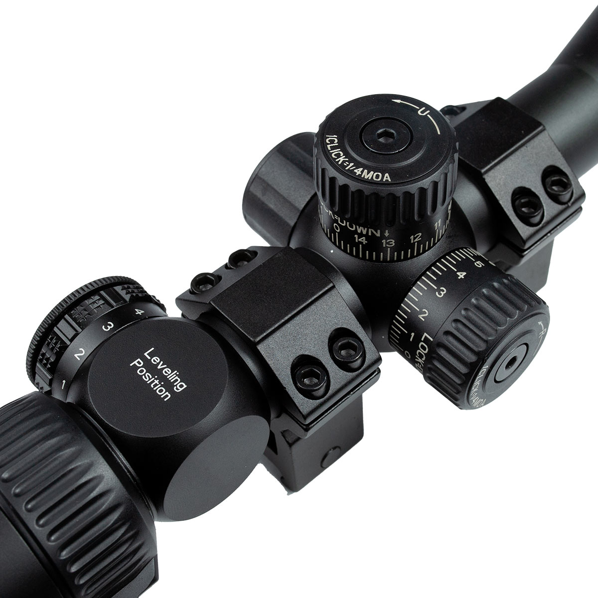 As torres de ajuste ainda possuem sistema de travamento de torres. A proporção do ajuste é de 1/4 MOA. Tem faixa de ajuste de 15 MOA.