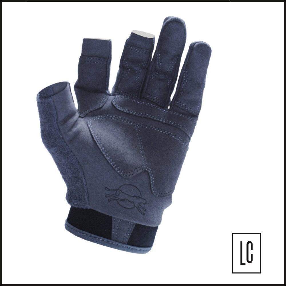 Recorte nos dedos polegar, indicador e médio para proporcionar maior área de contato e habilidade, palma com reforços para evitar atrito e queimaduras por linhas.