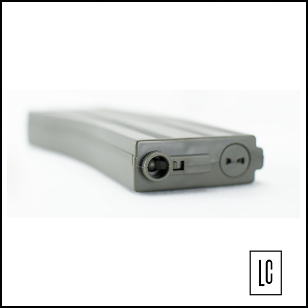 Carregador magazine mid cap com capacidade de 85 BB's para o modelo de airsoft Amoeba.