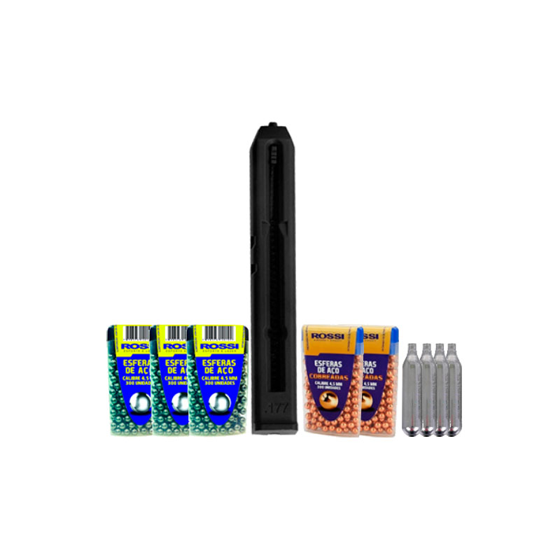 Acompanha 5 potes com 300 esferas de aço cada, para uso em sua pistola. Sendo 3 potes de esferas de aço comum e 2 de esferas de aço com acabamento cobreado, que tem maior durabilidade e resistencia contra oxidação.