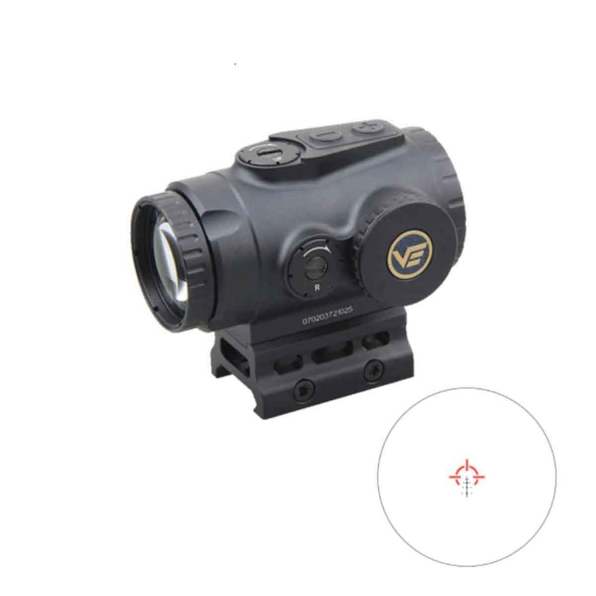 Conta com o retículo VEPS-MBR, que possui um sistema BDC (Bullet Drop Compensator). Este sistema tem marcações de queda balística calibradas para munição .223, permitindo que o atirador compense a trajetória do projétil em diferentes distâncias de forma intuitiva, sem precisar ajustar as torres. O retículo também tem um ponto central de 1 MOA para precisão em curta distância e iluminação vermelha com 10 níveis de intensidade.