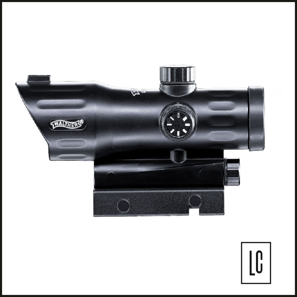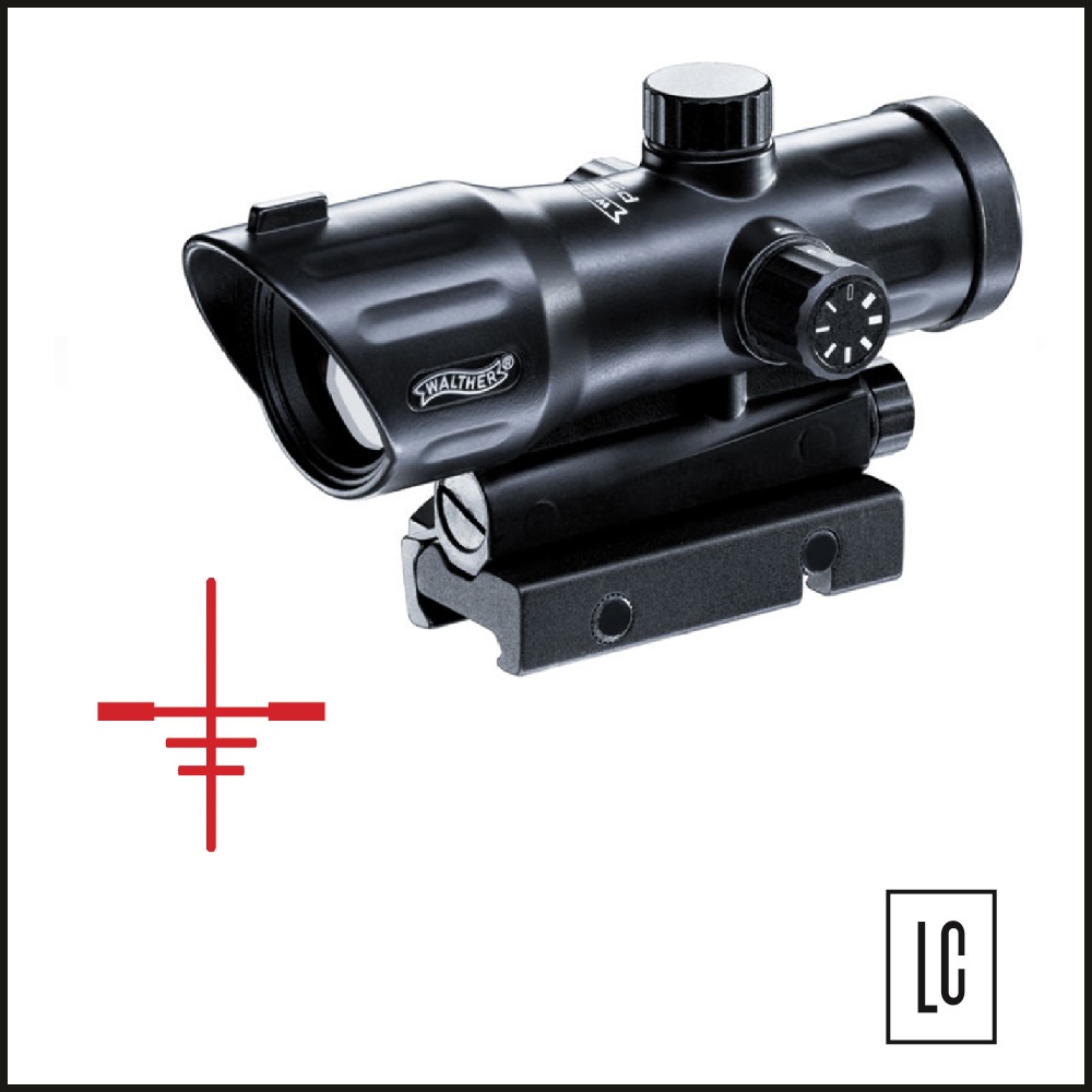 Mira com retículo vermelho - red recticle - de 30mm com brilho ajustável em 7 níveis para atirar em variadas distâncias. O alojamento em estilo militar é robusto. Adequado para trilho (22mm) tipo “rabo de andorinha” ou picatinny. Com parafusos grandes, a mira PS55 pode ser fixada de forma prática e rápida.
