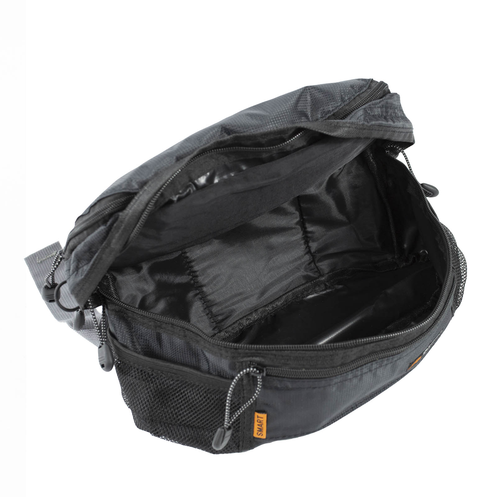 Possui duplo compartimento com acesso independente e mais 2 bolsos frontais para pequenos objetos. Nas laterais conta com 2 porta garrafas fabricados em tecido telado.