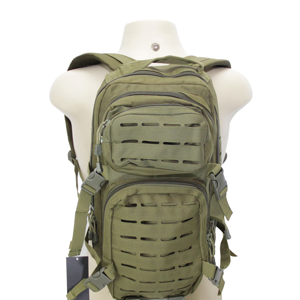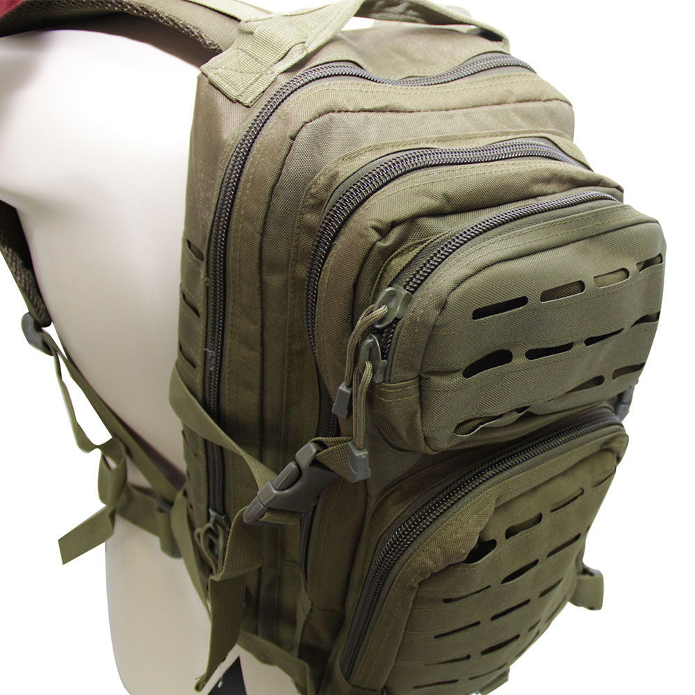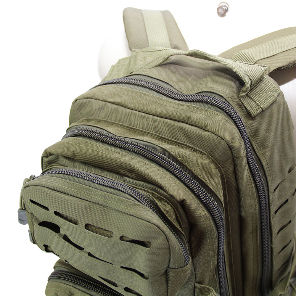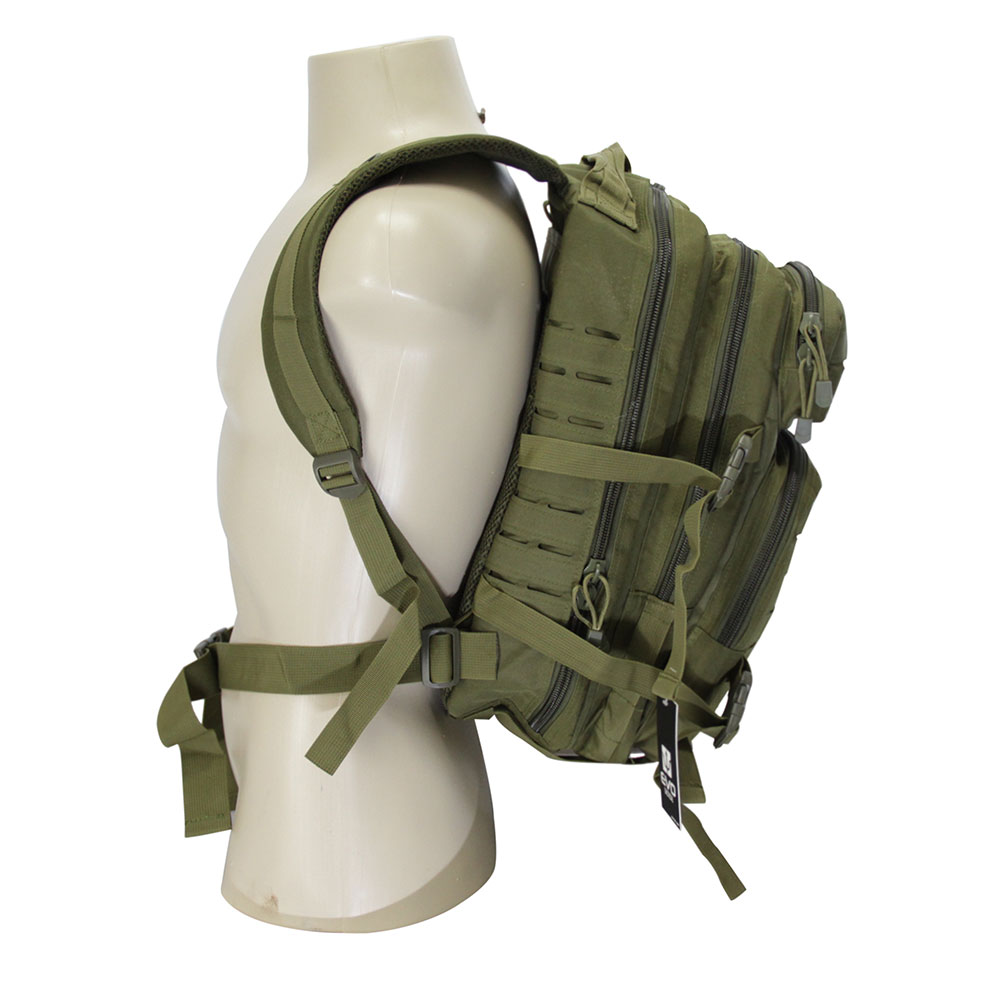 A Mochila tática assault é confeccionada em Nylon com fechos de zíper e de engate rápido.