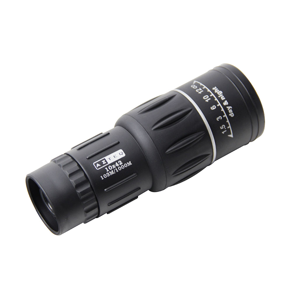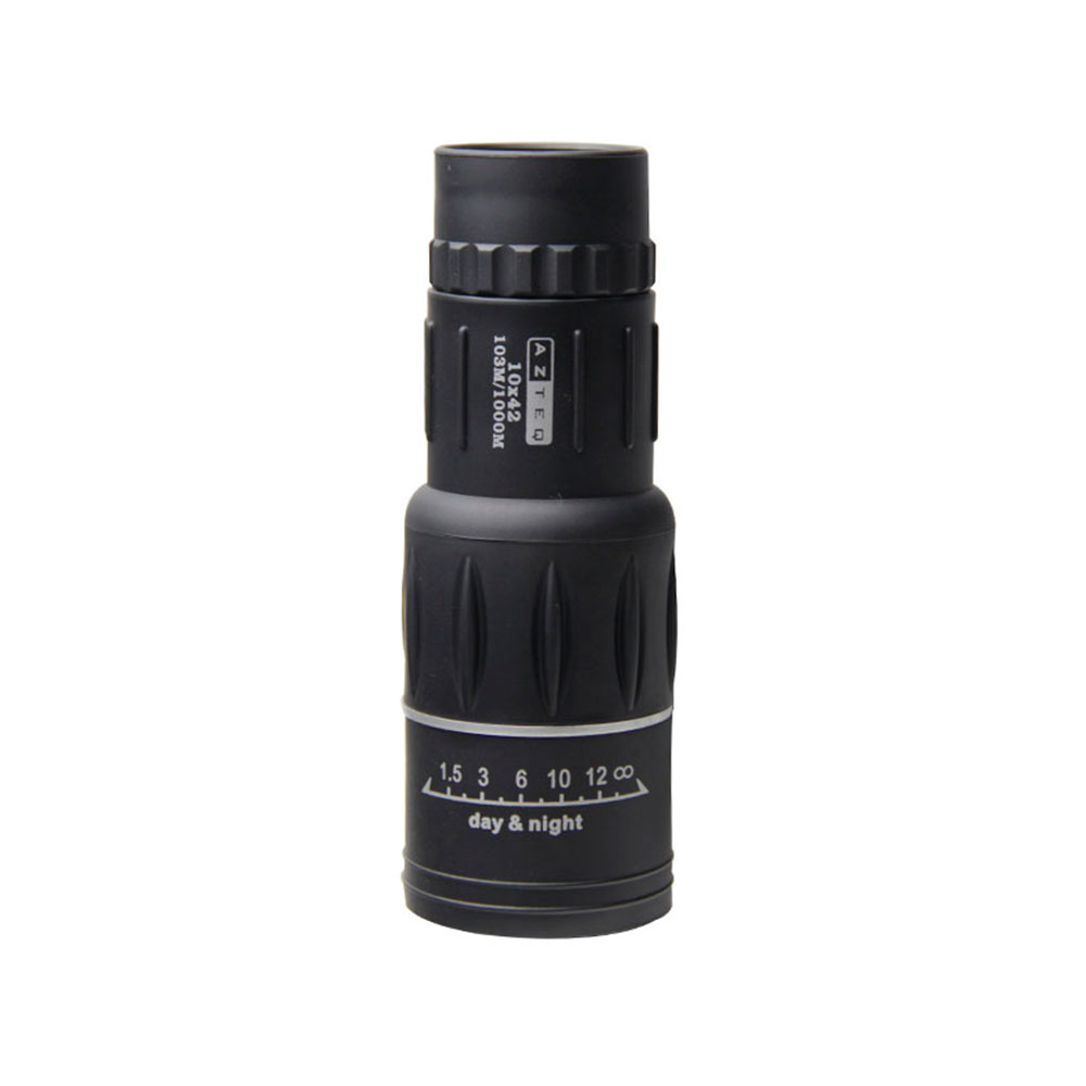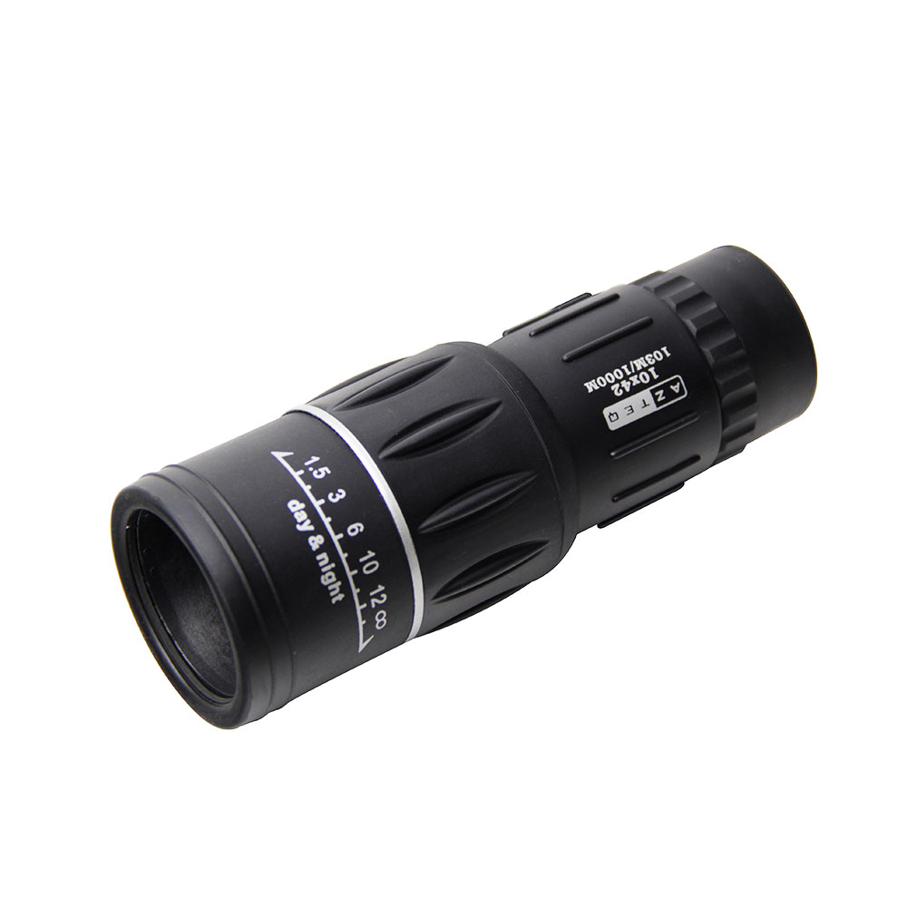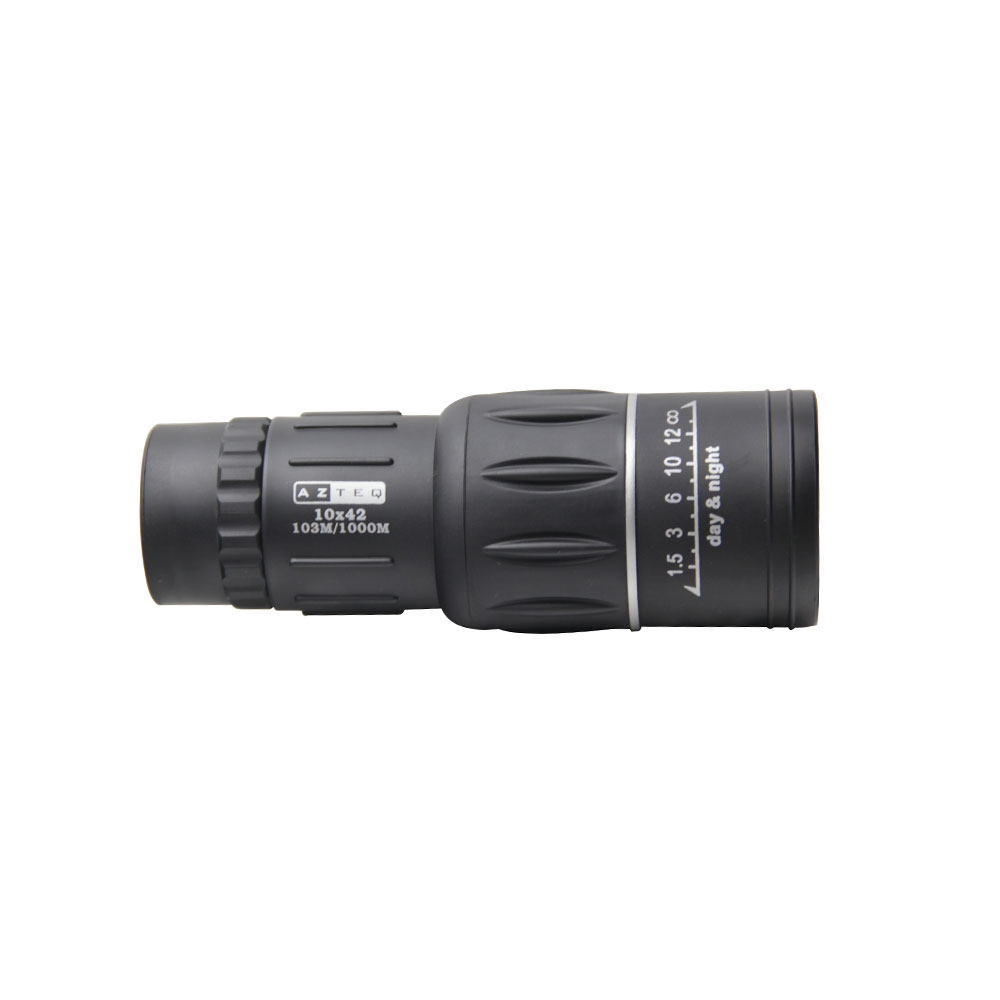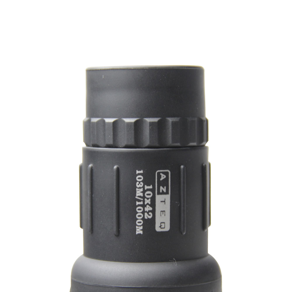 Monóculo 10x42mm tem corpo robusto e emborrachado, construído em polímero com revestimento PU e lentes em cristal/policarbonato