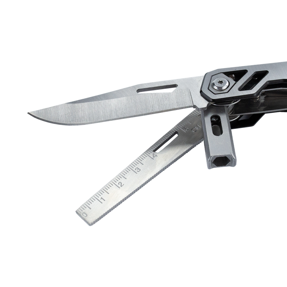 Conta com as seguintes funções: Alicate, lâmina de corte, Régua, Porta Bits, lâmina serrilhada, abridor de garrafas, lima, abridor de latas, lâmina serra.