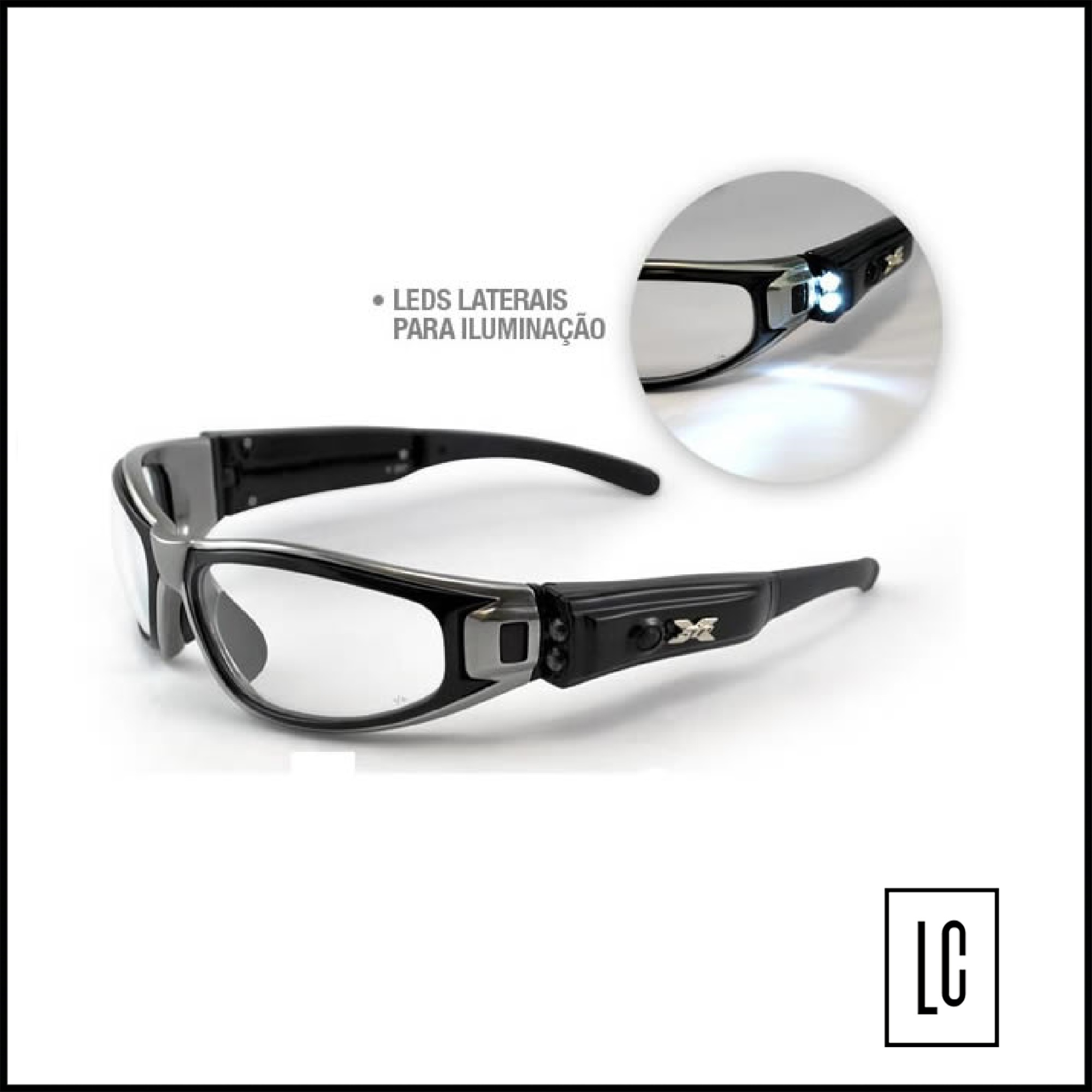 Óculos de segurança com lente de proteção em policarbonato oftálmico, com tratamento anti risco, antiembaçante, protetor nasal injetado de borracha haste tipo espátula, quatro led's laterais para locaixas de baixa luminosidade,