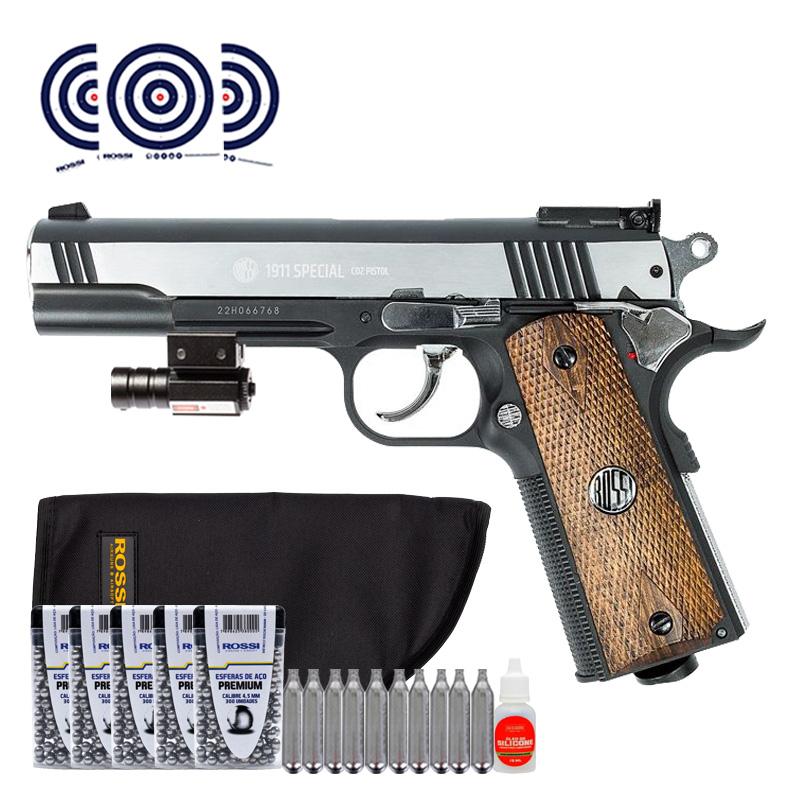 Pistola 1911 Combat Rossi CO2 4.5mm Full Metal + Capa + Mira Laser + Esferas + CO2 + Oleo + Alvos