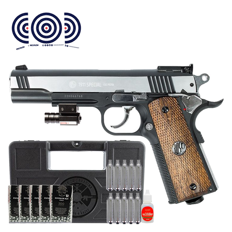 Pistola 1911 Combat Rossi CO2 4.5mm Full Metal + Maleta + Mira Laser + Esferas + CO2 + Oleo + Alvos
