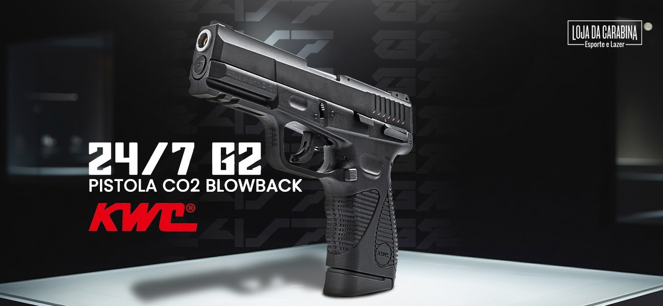 Pistola 24/7 G2 com BlowBack é uma Pistola Co2 com alto nível de realismo, perfeita para a prática de tiro! Foi inspirada na reconhecida Taurus 24/7. Com ação semi-automática essa Pistola KWC utiliza esferas de aço 4.5mm como munição, chegando a cerca de 105m/s*. Sua autonomia chega a 80 disparos. Com Slide em metal e corpo em polímero, tem uma alta resistência. Possui trilho de 20mm para lanterna e conta com miras fixas. Empunhadura bem firme. Garanta logo a sua Pistola de Pressão 24/7!