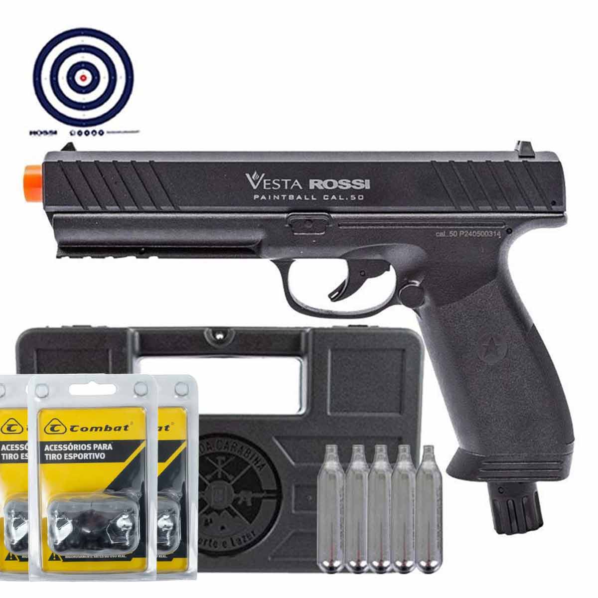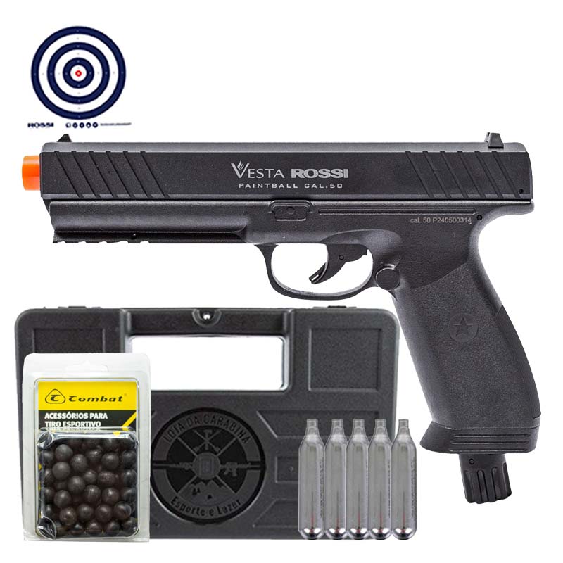 Combo completo contendo Maleta Rígida para transportar sua arma em segurança, Esferas .50 para municiar sua pistola, Cilindros de CO2 para impulsionar seus disparos e Alvos de Treino Rossi.