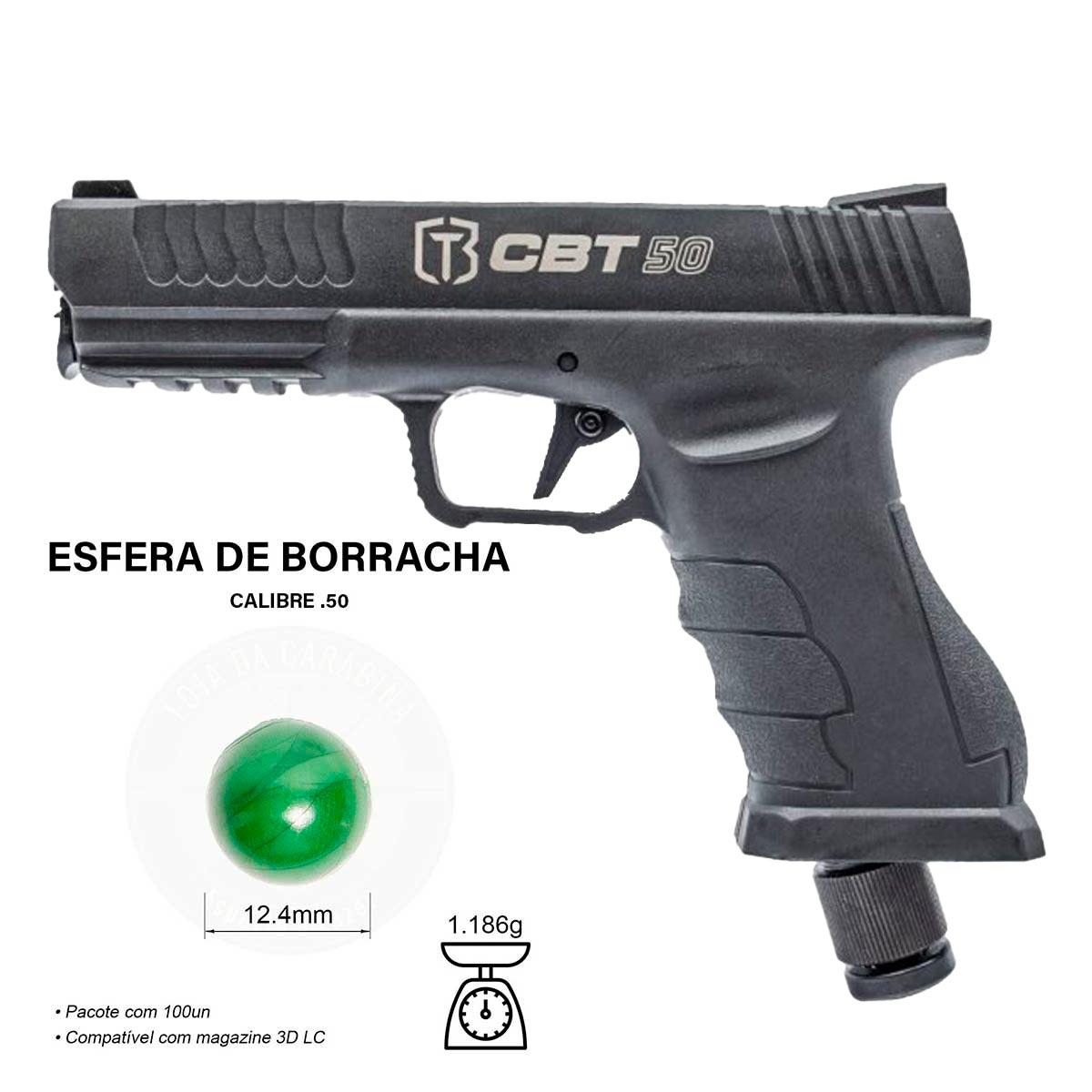 - Munição compatível: Esferas de borracha, Esferas de Alumínio, Esferas de plástico, paintballs e bolas de pimenta no calibre .50