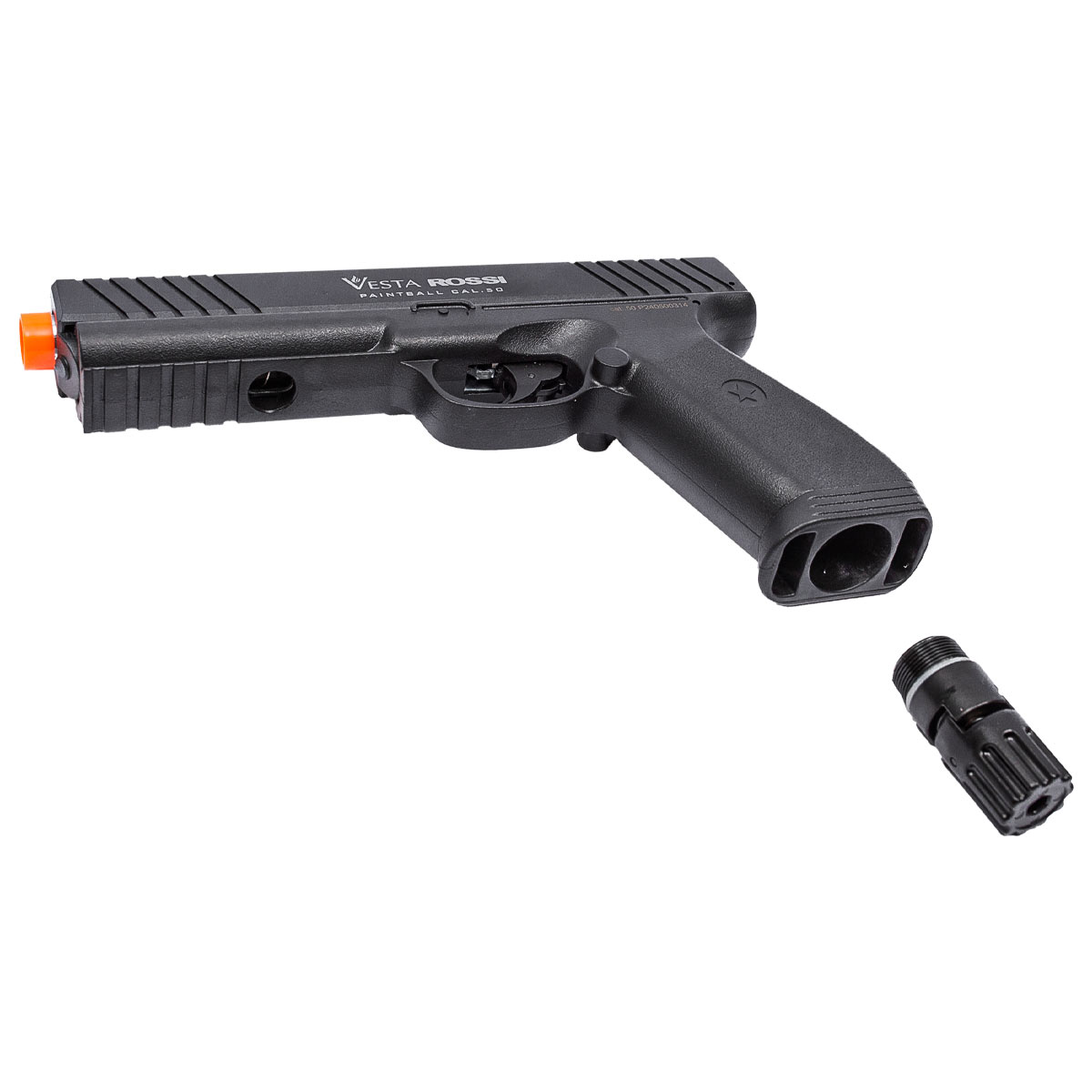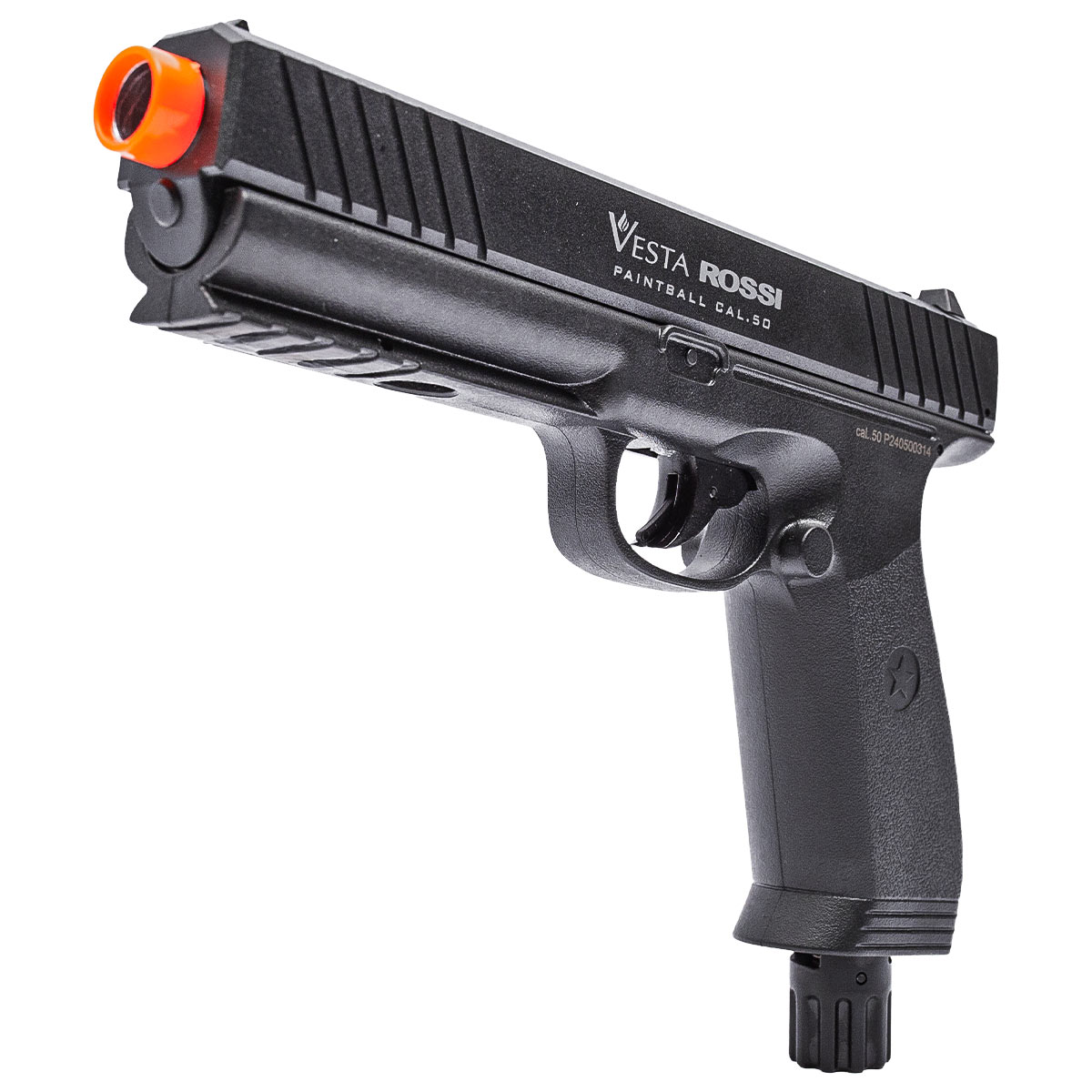 Possui magazine para 6 munições e é compatível com Esferas de borracha, Esferas de Alumínio, Esferas de plástico, paintballs e bolas de pimenta no calibre .50.