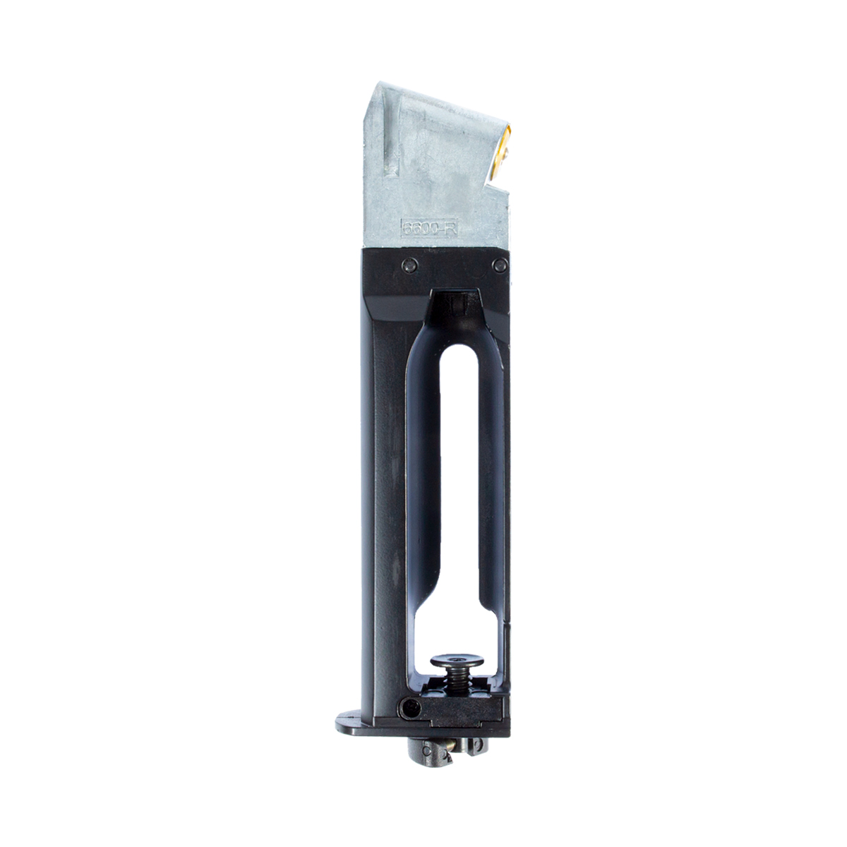 Seu magazine é fabricado em metal e tem capacidade para até 20 disparos.