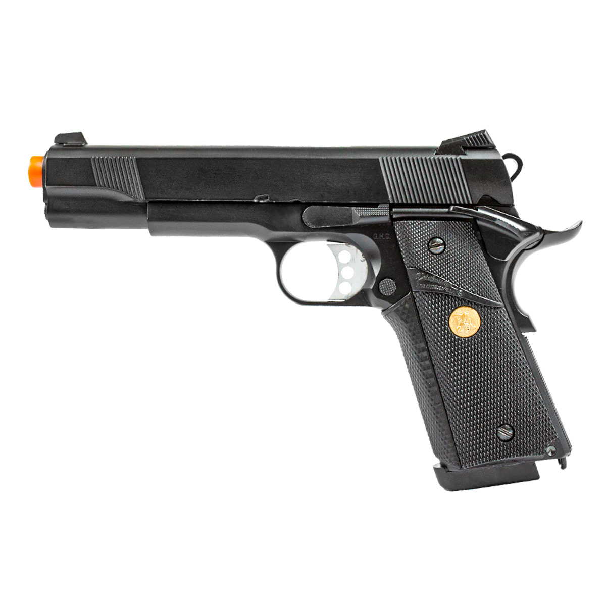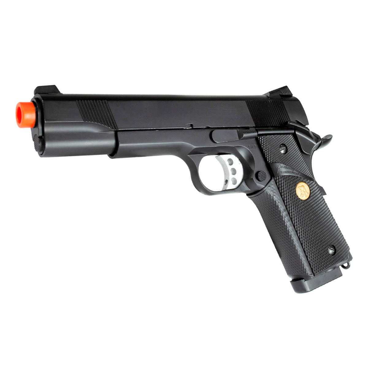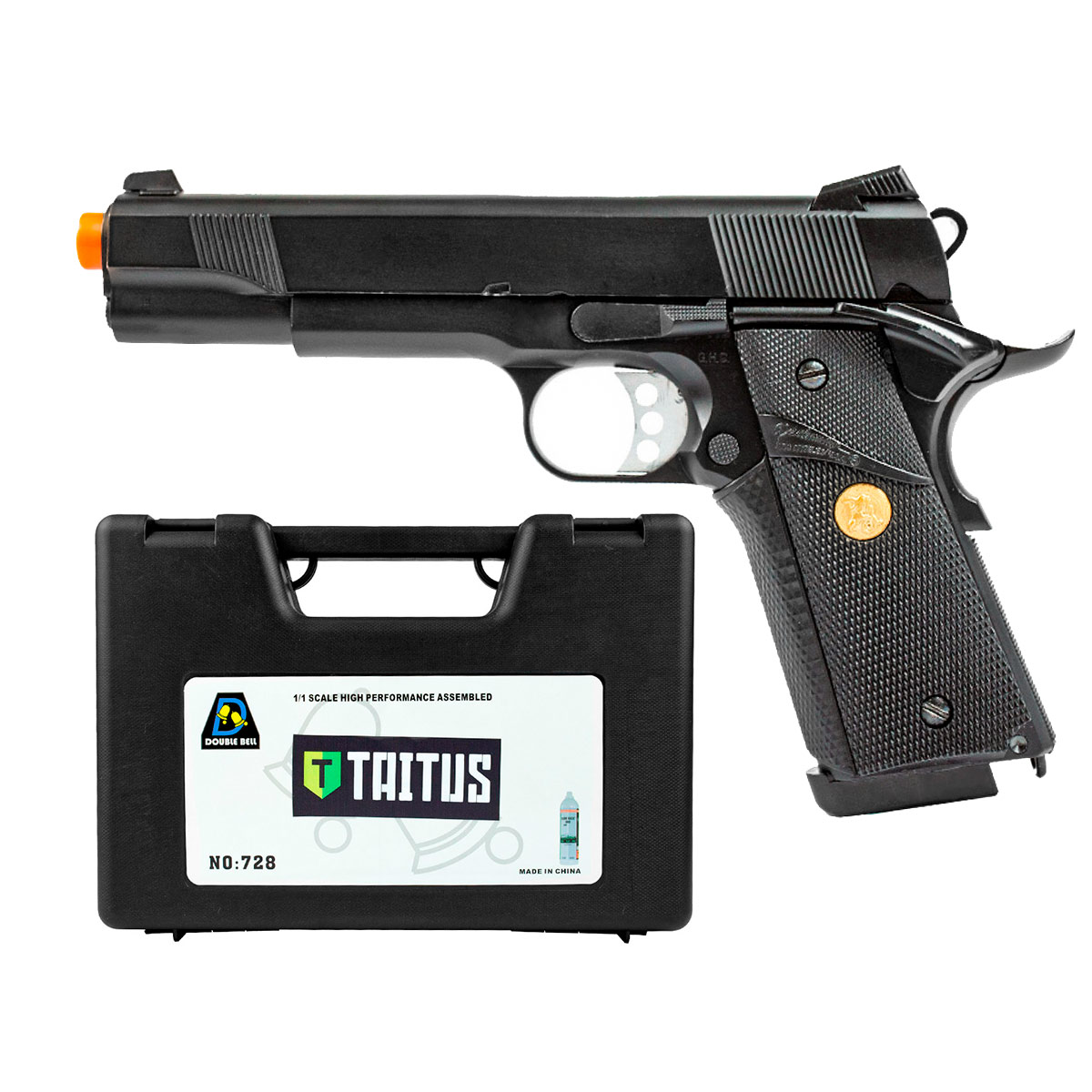 A Pistola Airsoft a Gás 1911 728 é fabricada pela Double Bell, inspirado na famosa Pistola 1911 Colt. Tem altíssimo realismo e detalhes feitos para impressionar! Seu gatilho prata e detalhe dourado na empunhadura deixam essa pistola ainda mais bonita.