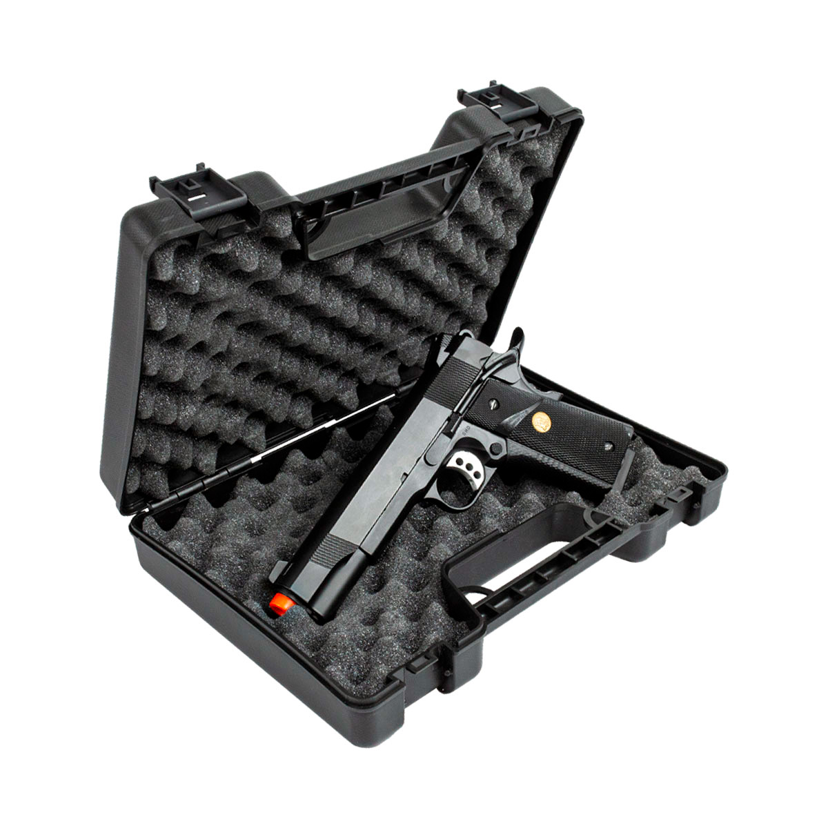 Essa Pistola Green Gás acompanha uma case rígida personalizada Double Bell para que você possa transportar e guardar sua pistola, evitando arranhões e protegendo da poeira do ambiente. A case possui espuma interna para maior proteção.