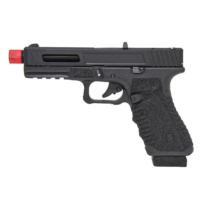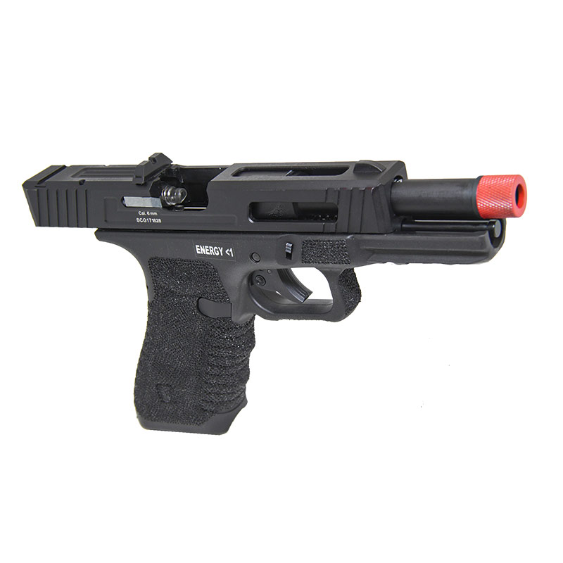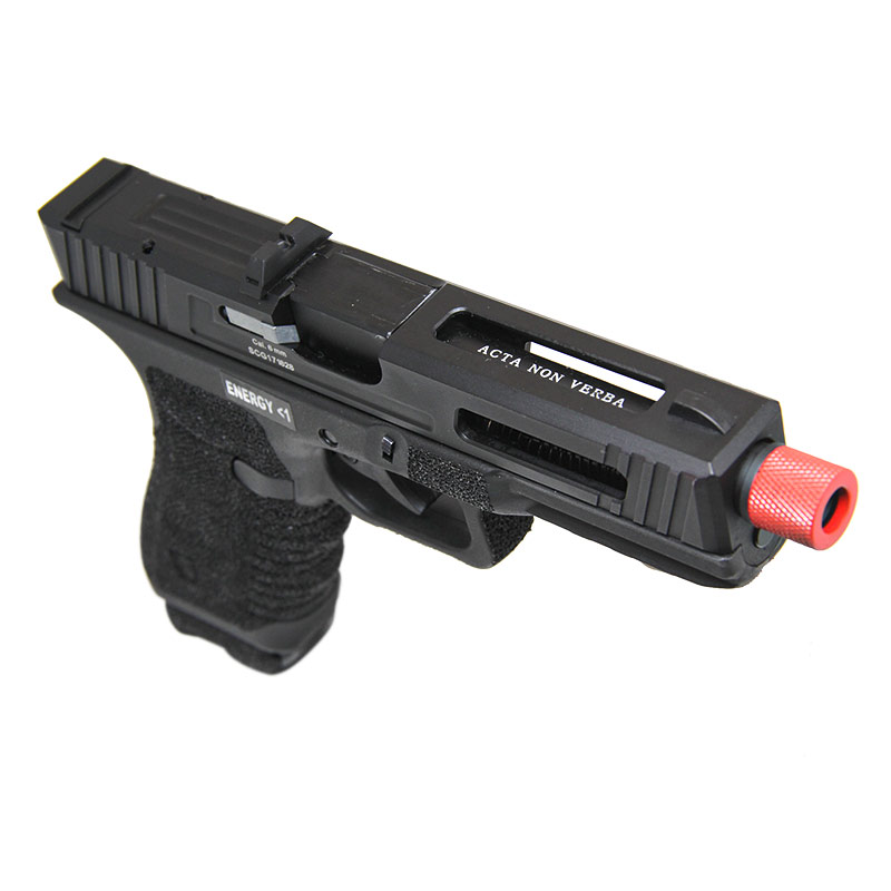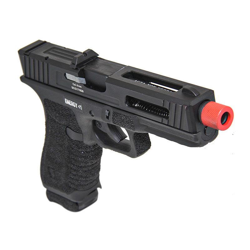 A ponteira vermelha é facilmente removível liberando uma rosca padrão de 14mm para fixação de silenciador de pistola, deixando essa Pistola Secutor Airsoft com um visual diferenciado.