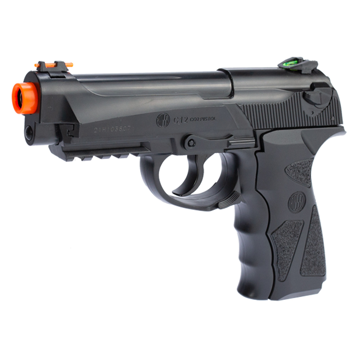 A Pistola Airsoft Rossi C12 segue a mesma linha das pistolas C11, só que com algumas alterações. Conta com alça e massa de mira em fibra óptica, design mais tático, oferecendo uma ótima pegada com o grip ergonômico e seu magazine tem capacidade para 15 BBs.