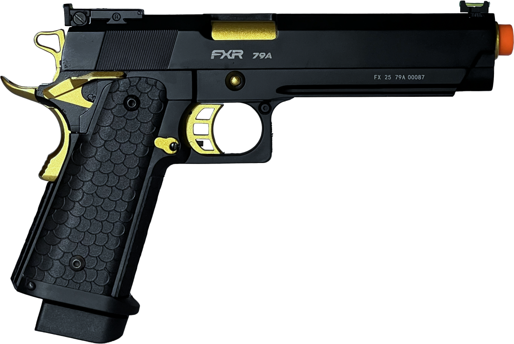 A Pistola Airsoft Double Bell 1911 Hi-Capa 79A GBB Full Metal FXR 6mm é um modelo que combina potência, realismo e acabamento premium, ideal para jogadores de airsoft que buscam performance e presença em campo. Seu visual na cor preta com detalhes dourados confere um estilo marcante, enquanto a construção full metal garante alta durabilidade e peso realista de aproximadamente 1000g.