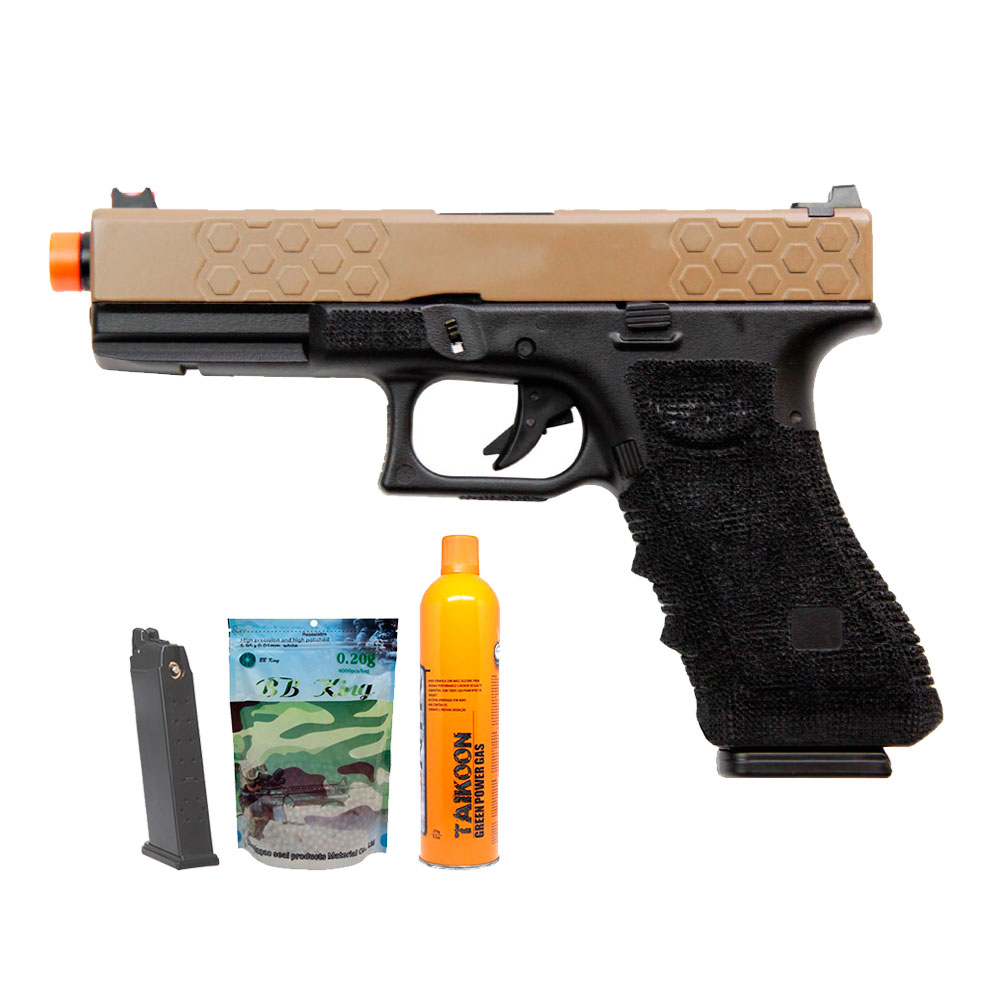 Seu sistema de propulsão é por green gás ou gás propano, que torna o recarregamento do gás mais prático e mais barato que o CO2, ideal para jogos de airsoft.
