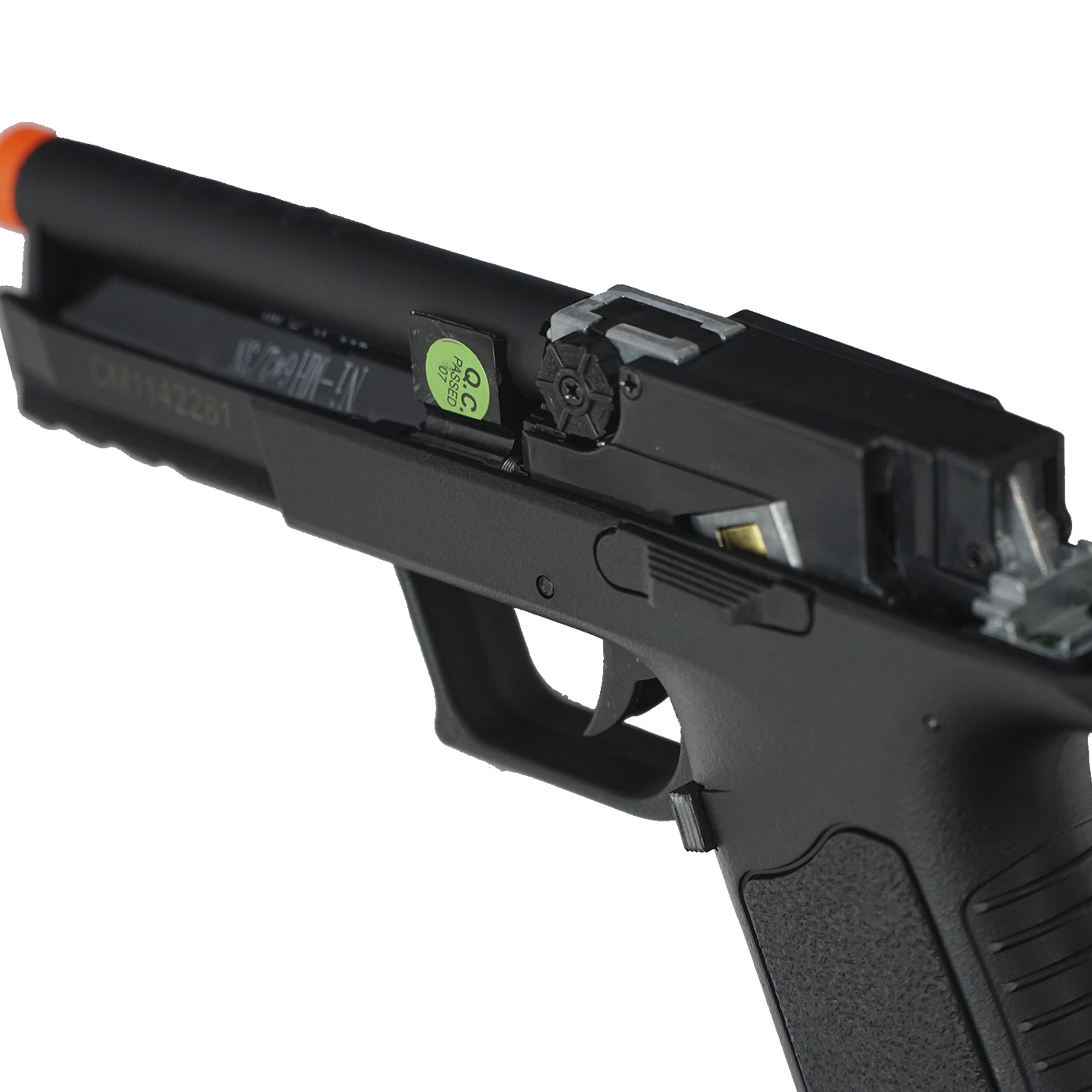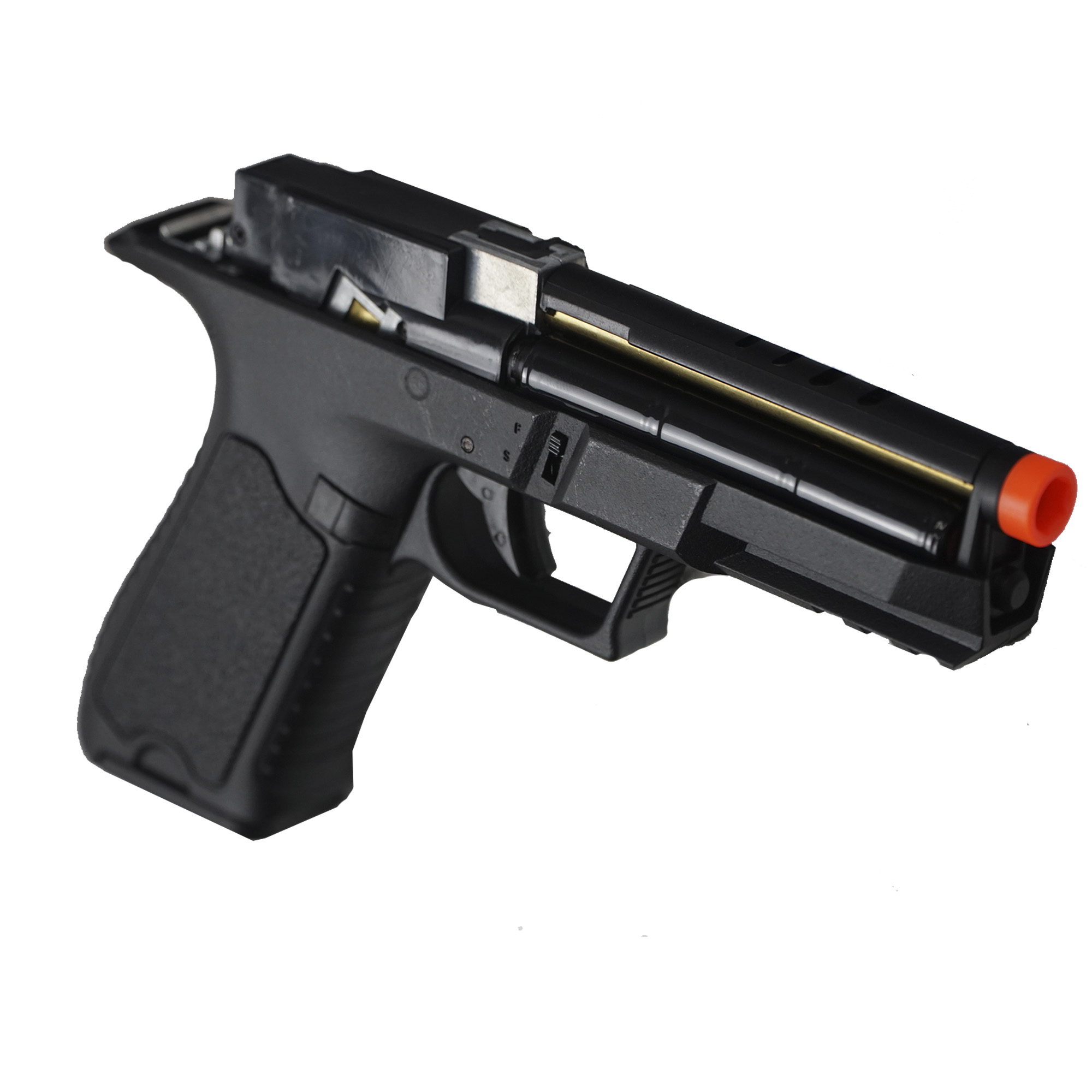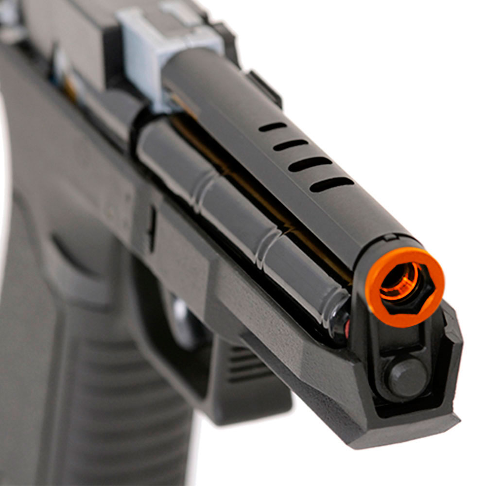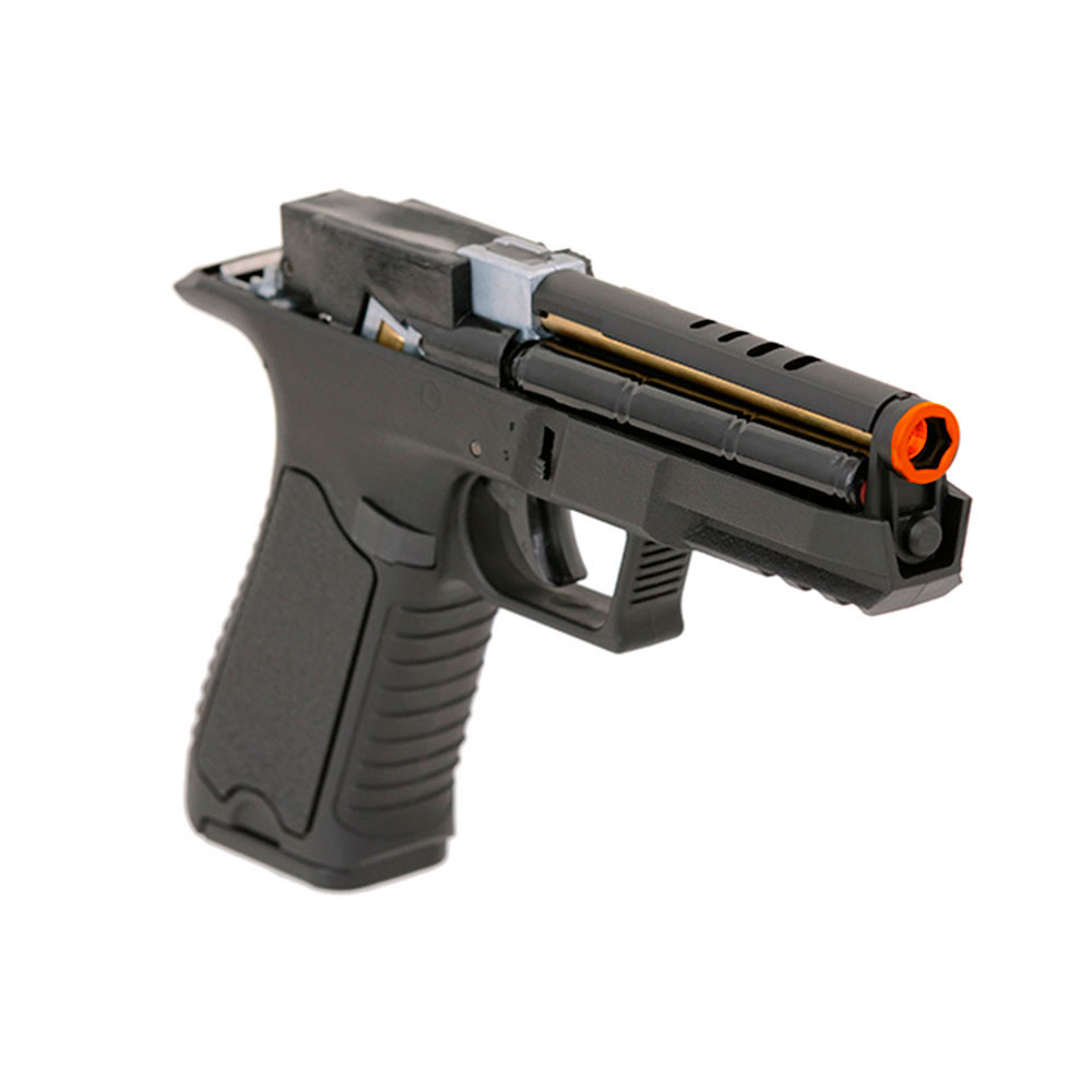 O acesso a fiação da bateria e ao Hop-up é feito removendo o slide da pistola.