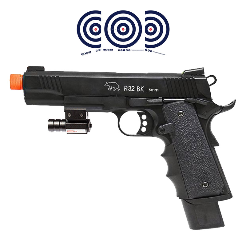 Equipada com trilho tático inferior de 20 mm, a pistola permite a instalação de acessórios, como a mira laser inclusa no kit, que emite feixe vermelho com regulagem vertical e horizontal, auxiliando na visada e no treinamento. A rosca 14 mm anti-horária amplia as possibilidades de customização com acessórios compatíveis.