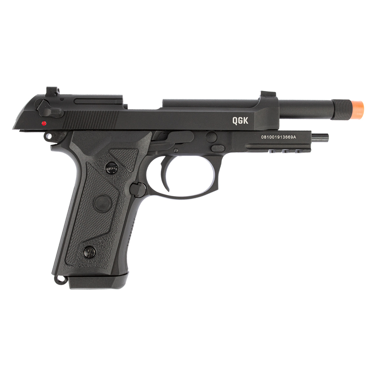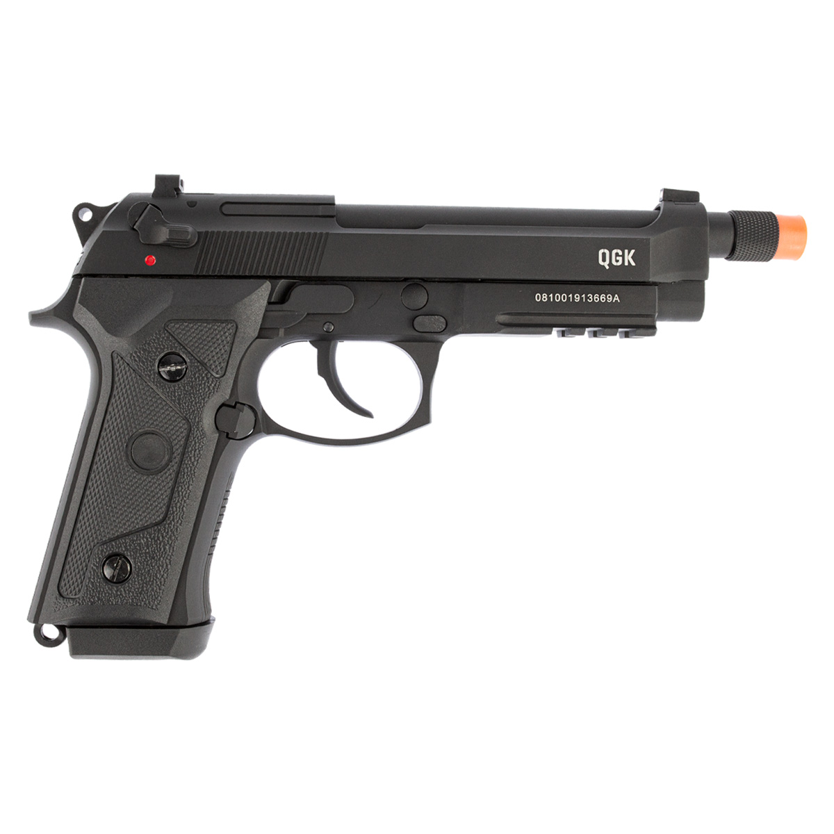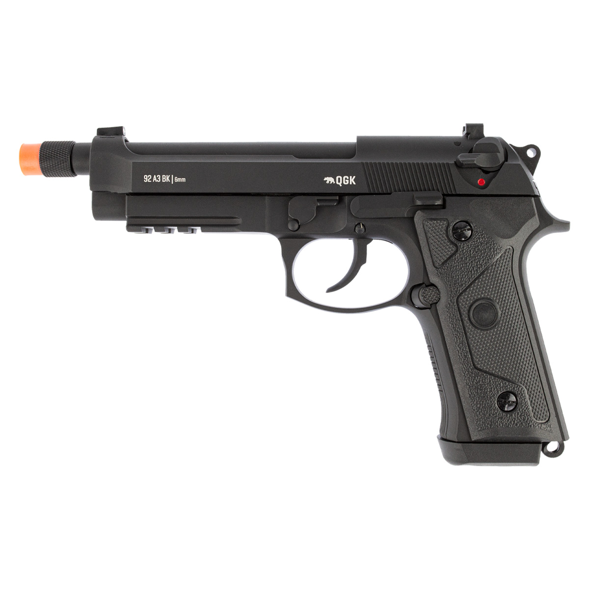 A Pistola de Airsoft GBB Beretta 92 A3 BK da QGK é uma pistola muito realista, bastante fiel ao modelo Beretta M9A3, com seu cano mais alongado e trilho inferior de 20mm para instalação de acessórios, deixando assim esse modelo mais tático se comparado as Berettas M92.