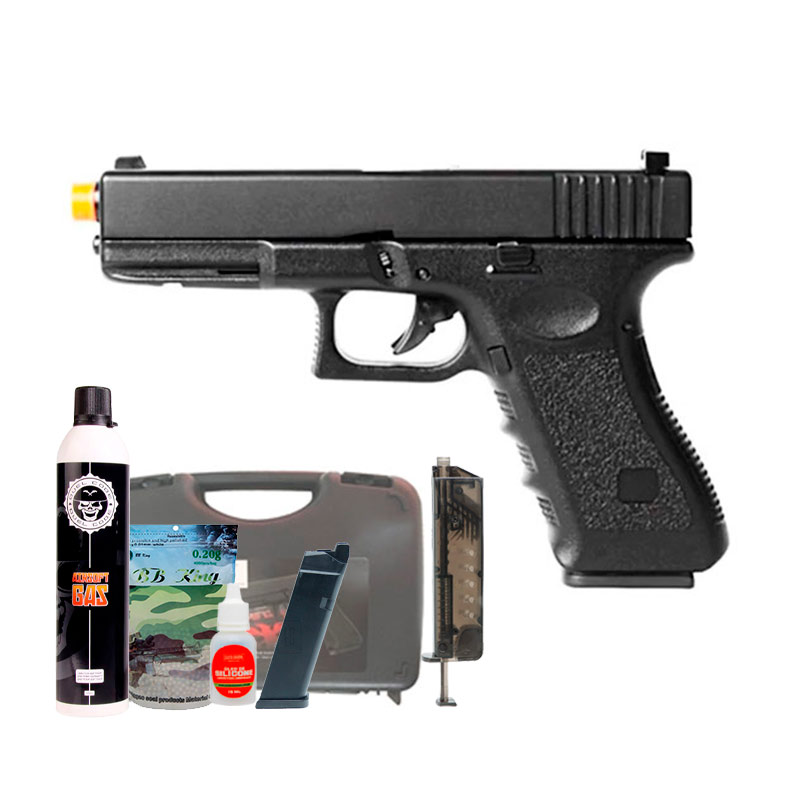 Acompanha magazine extra! Também um pacote com 4000 BBs 0,20g, óleo de silicone para manutenção correta da sua Pistola Glock, cilindro Green Gás e Speedloader. Completa para você!