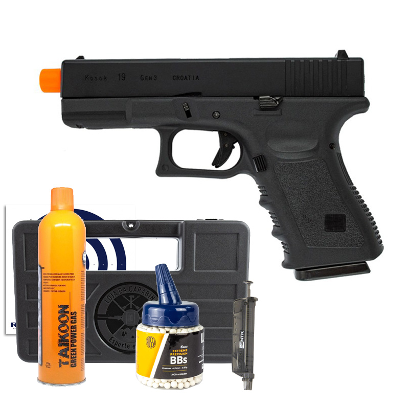 PISTOLA AIRSOFT G19 + SPEEDLOADER NTK + BB'S 0.20G + GREEN GÁS + ALVO + CASE RÍGIDO