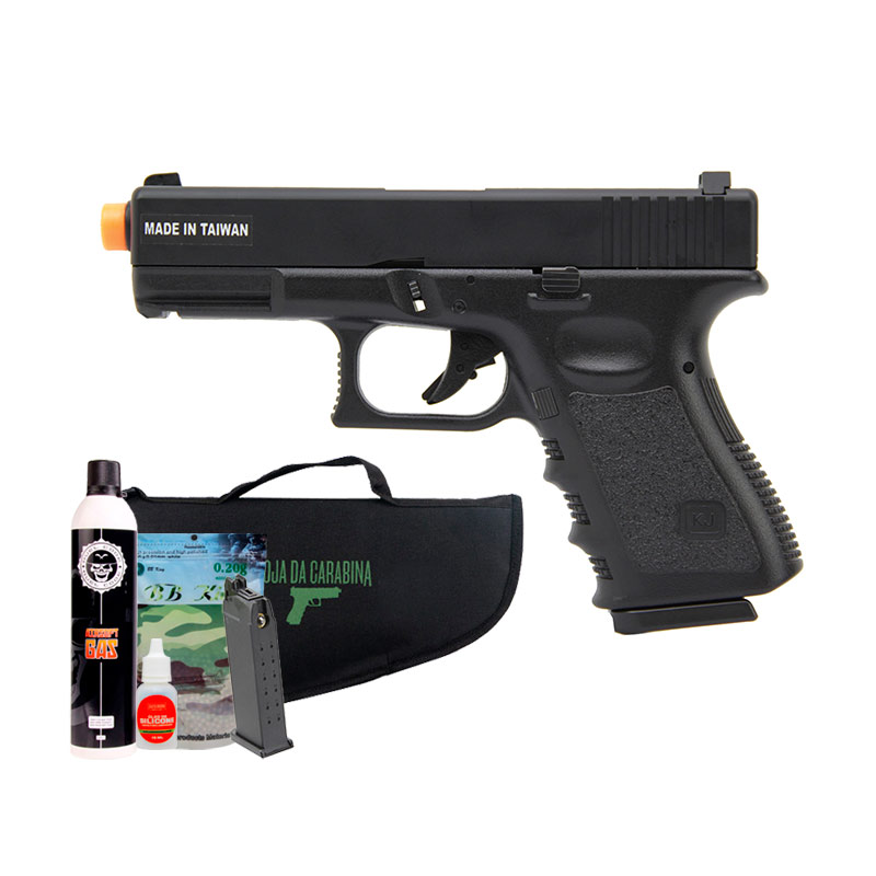 A Pistola Glock G23 é fabricada em polímero de alta densidade e possui magazine em metal com capacidade para até 20 bbs. Nesse kit acompanha magazine extra.